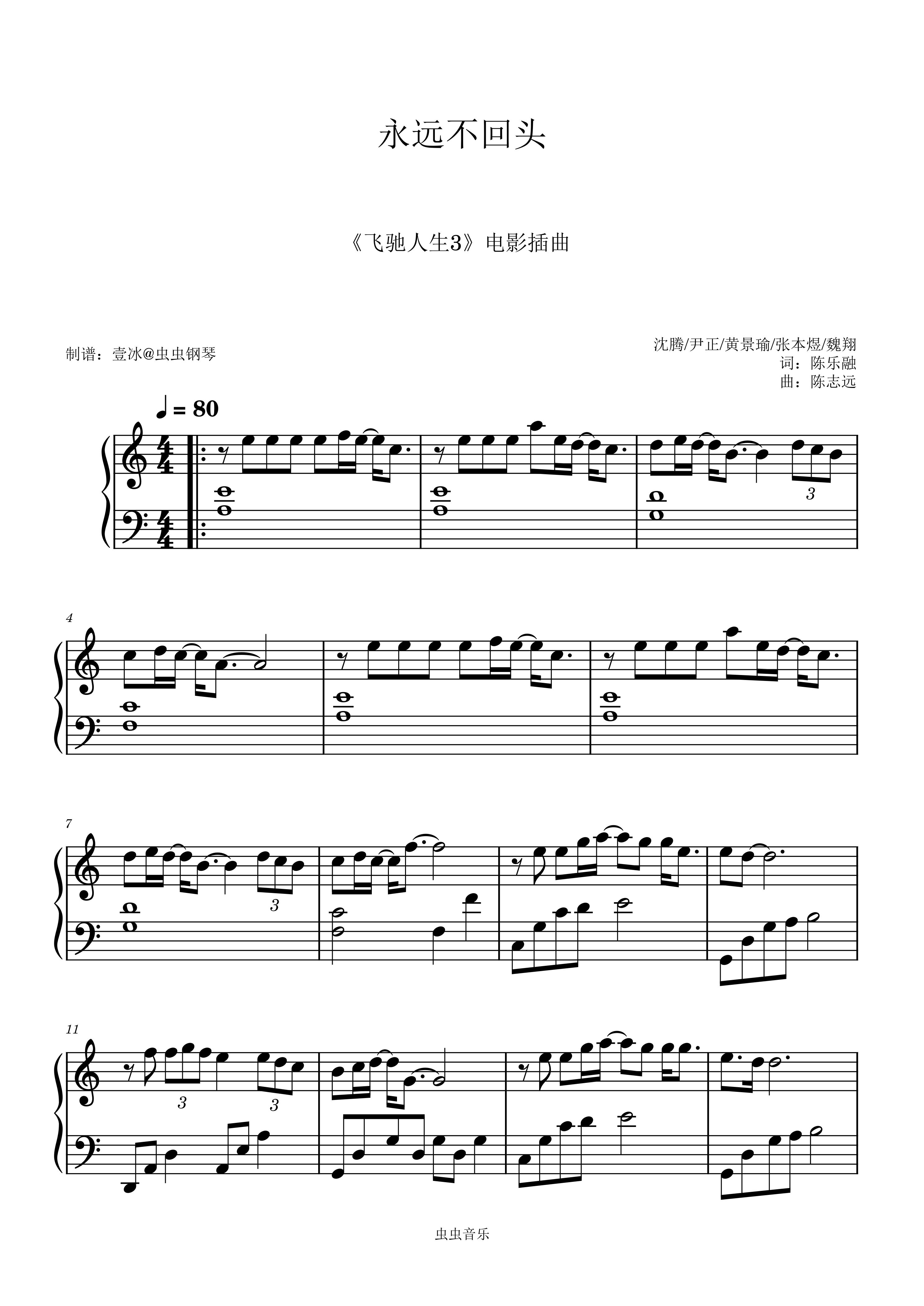 钢琴谱:永远不回头 (《飞驰人生3》电影插曲) - C调