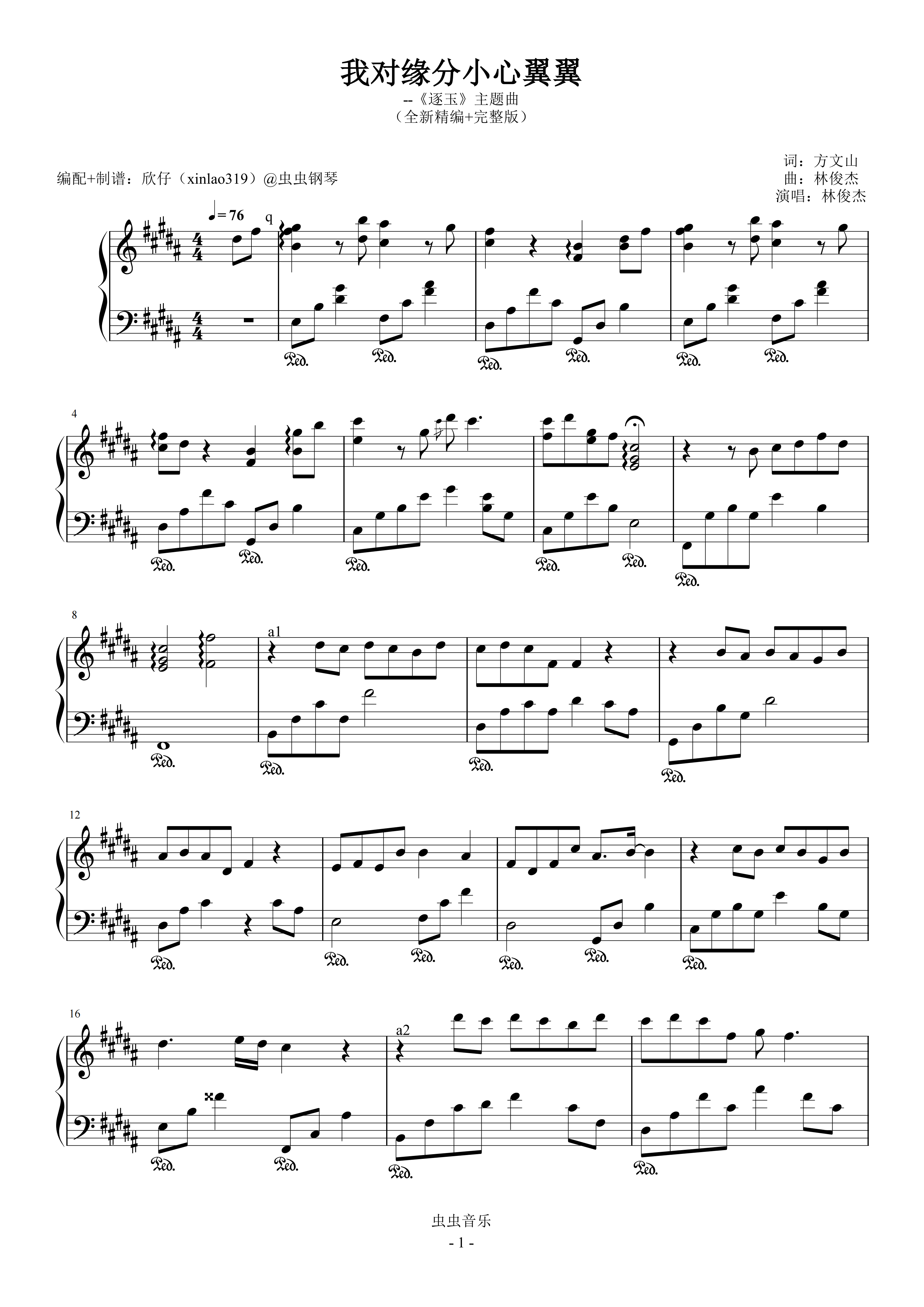 钢琴谱:我对缘分小心翼翼(原调B、林俊杰《逐玉》主题曲、完整版)