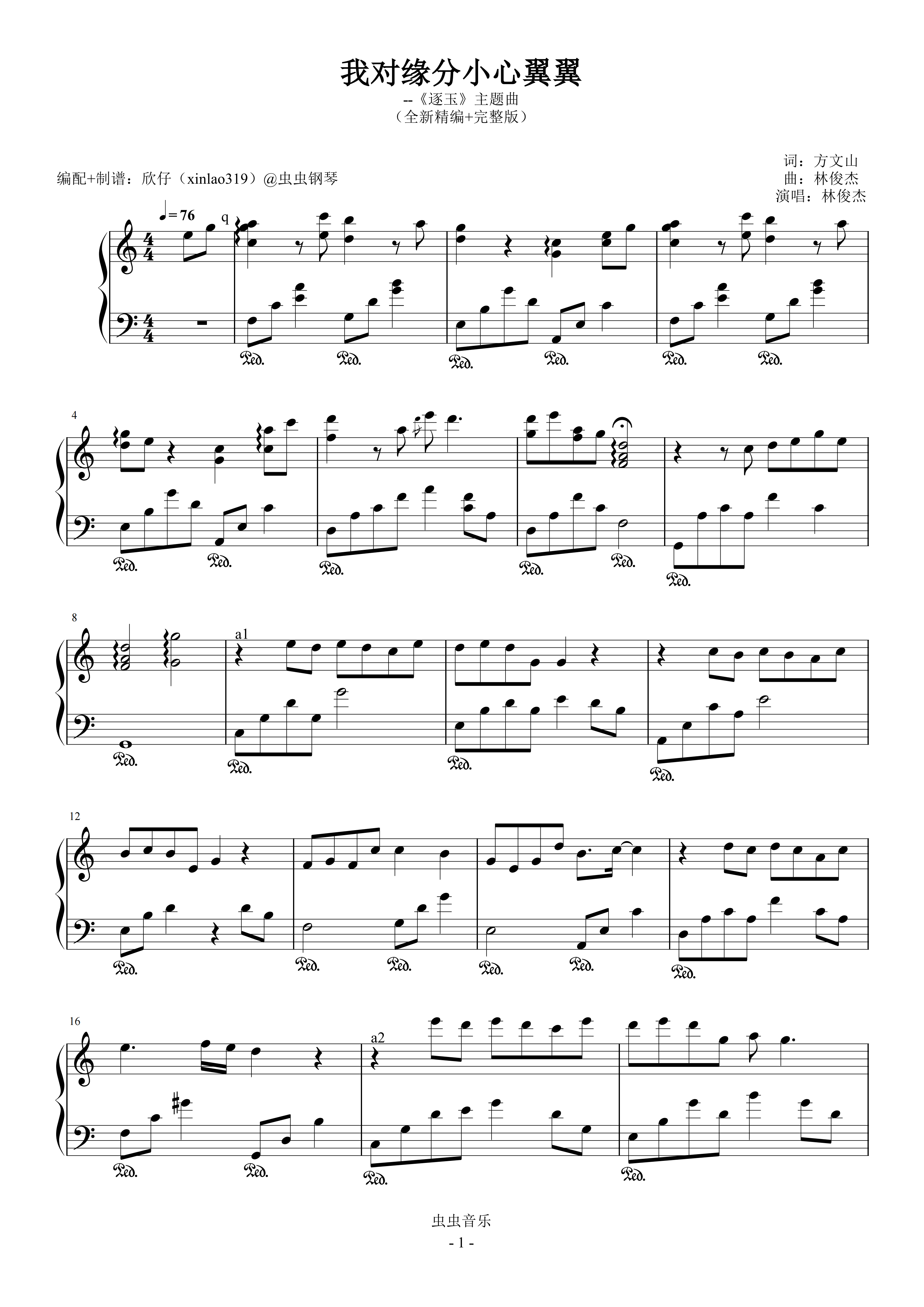 钢琴谱:我对缘分小心翼翼(C、林俊杰《逐玉》主题曲、完整版)