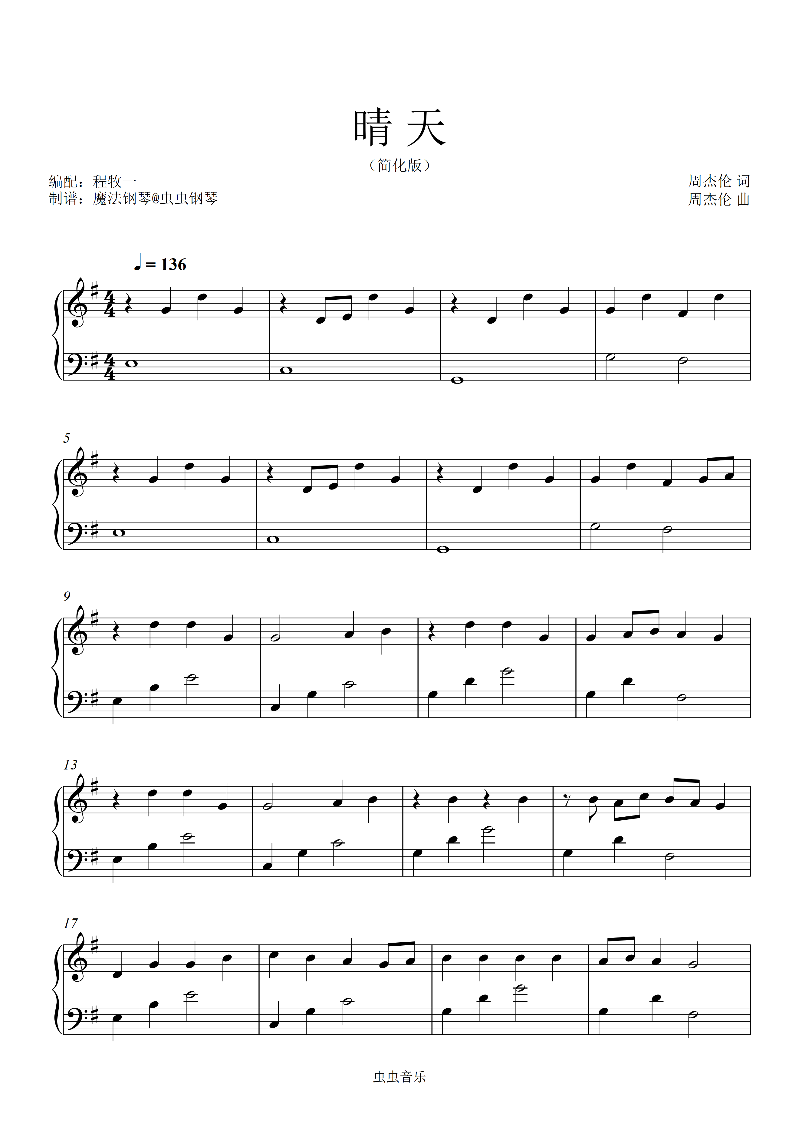 • 晴天钢琴简谱 G调 数字双手