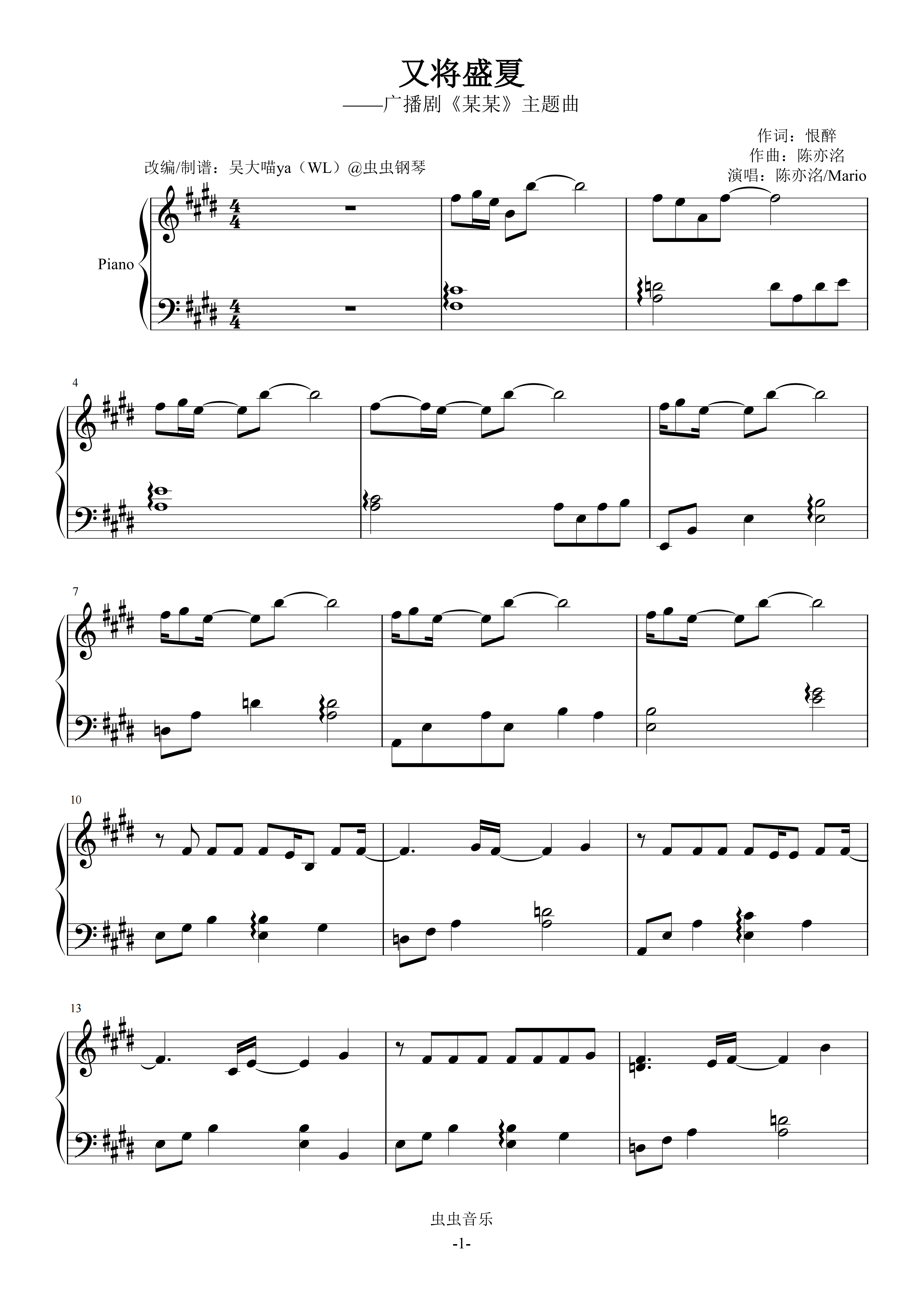钢琴谱:又将盛夏-广播剧《某某》主题曲 原调