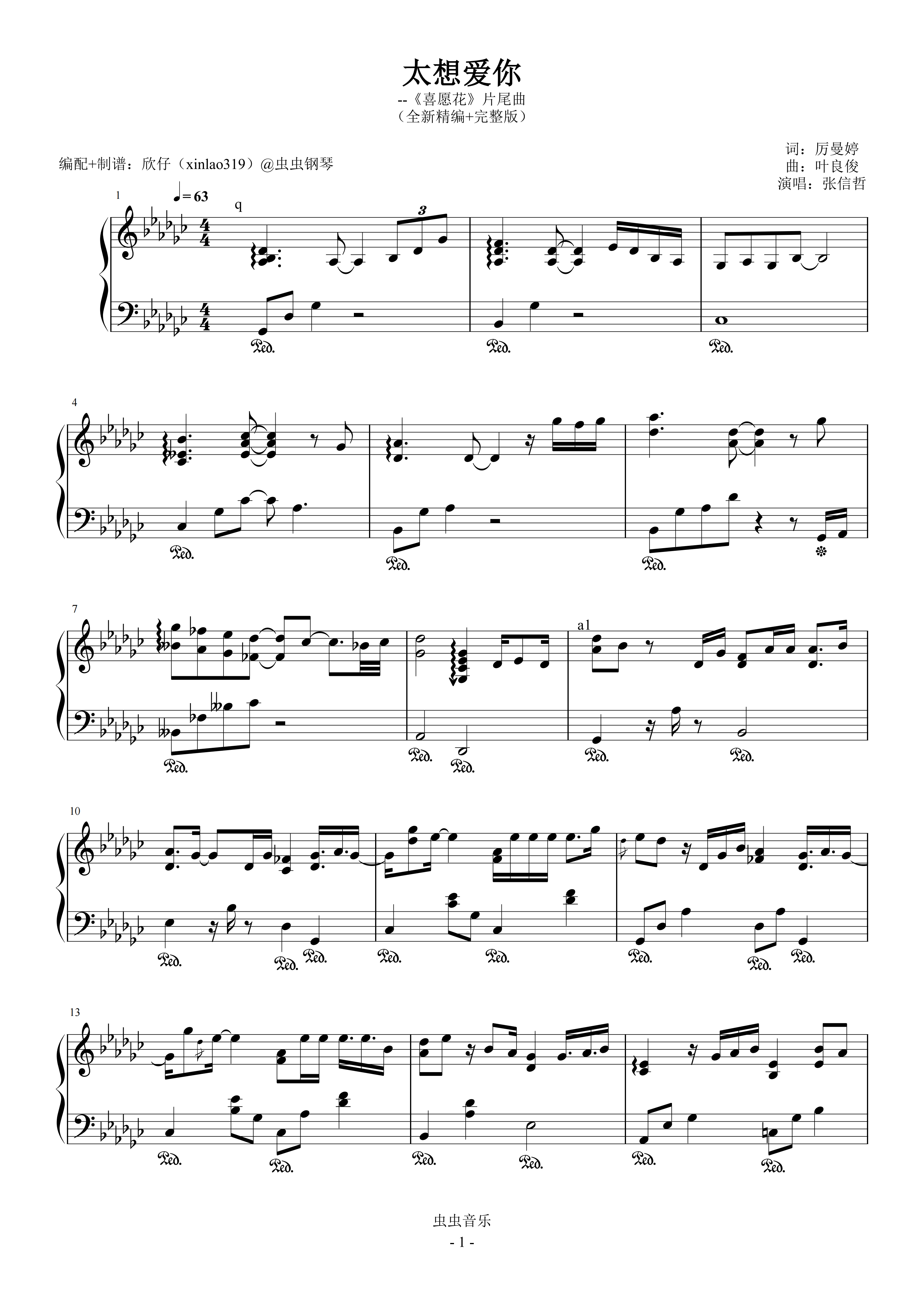 钢琴谱:太想爱你(原调降G、张信哲、完整版)