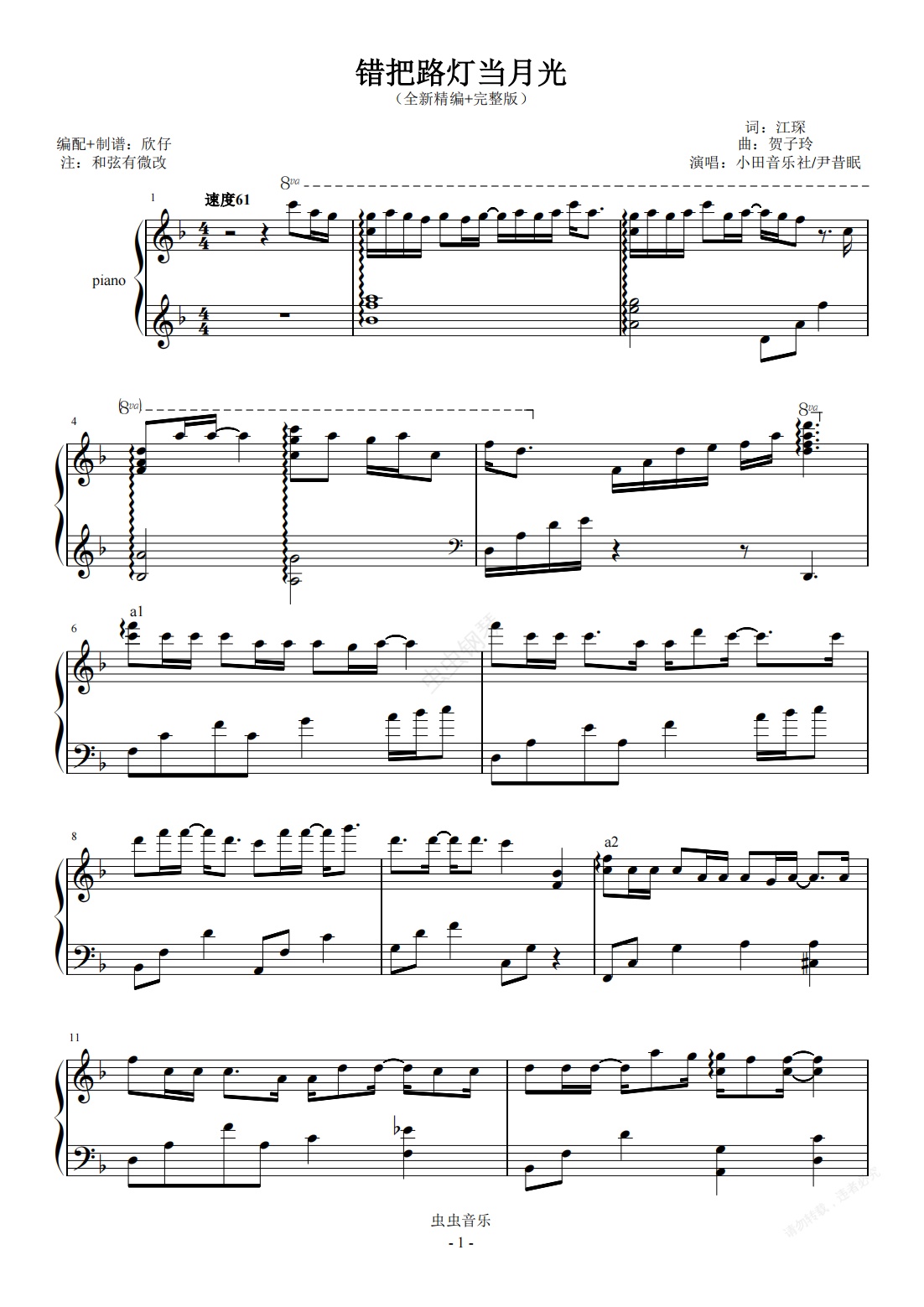 钢琴谱:尹昔眠-F《错把路灯当月光》(全新精编+完整版)