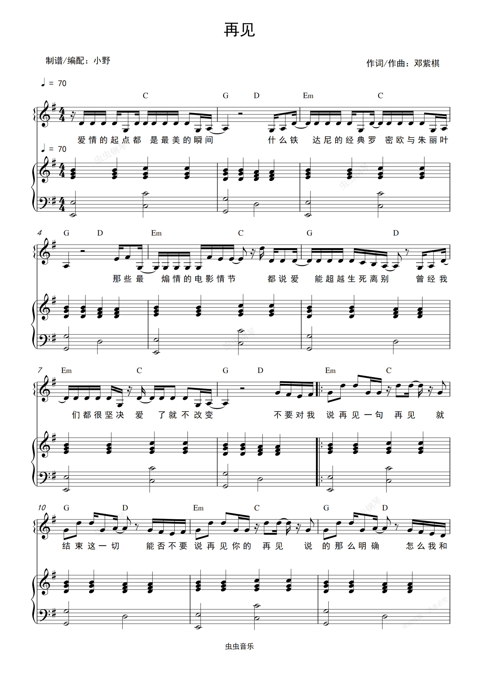钢琴谱:再见(和弦弹唱版)