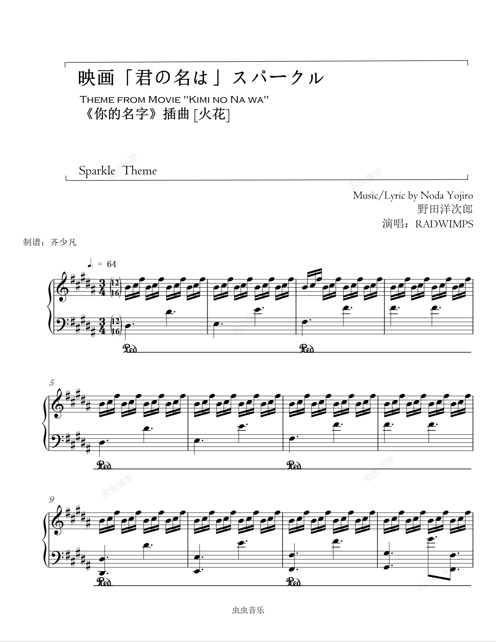 钢琴谱:火花 Sparkle スパークル--你的名字