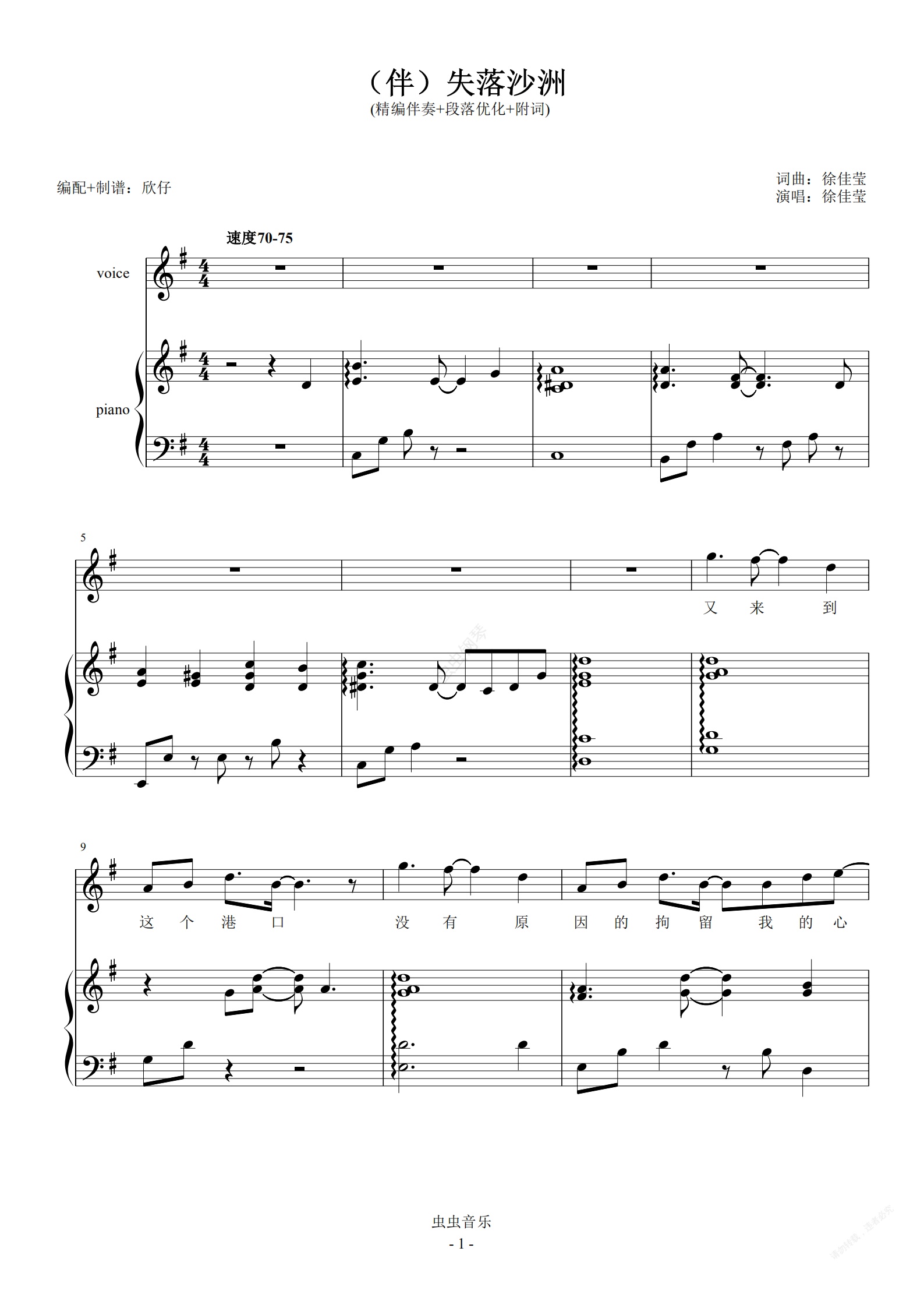 钢琴谱:伴-徐佳莹G《失落沙洲》(精编伴奏+段落优化+附词)