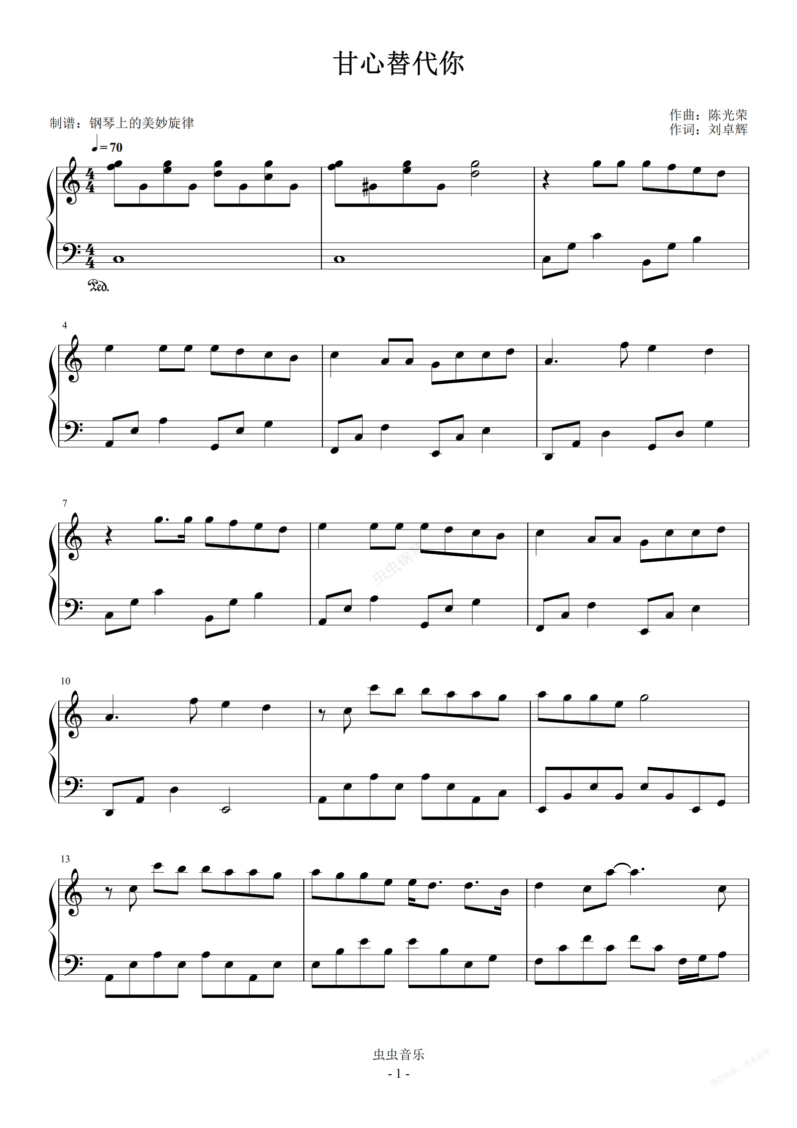 钢琴谱:甘心替代你 C调简易  毛不易