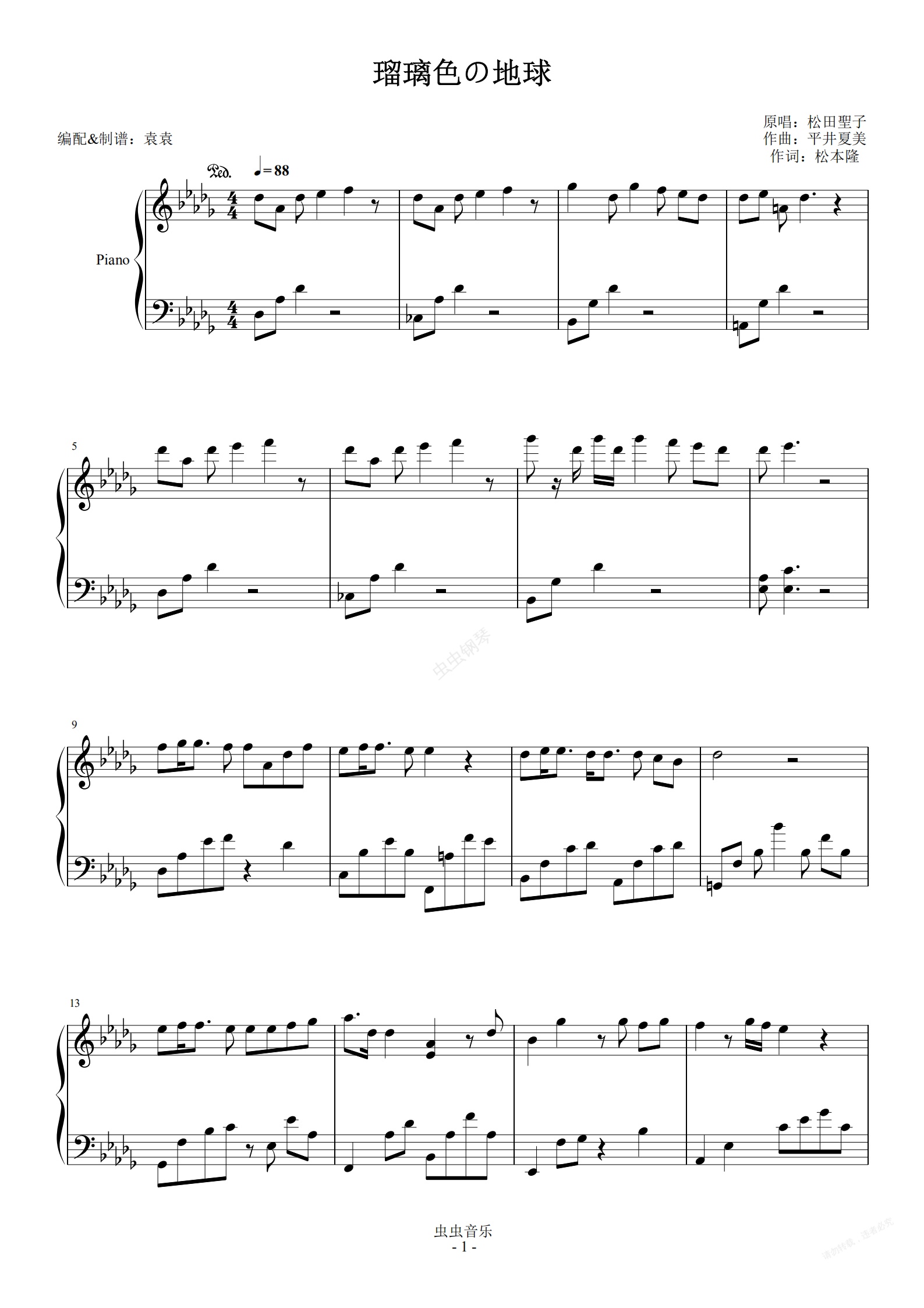 钢琴谱:琉璃色的地球 电影烟花插曲