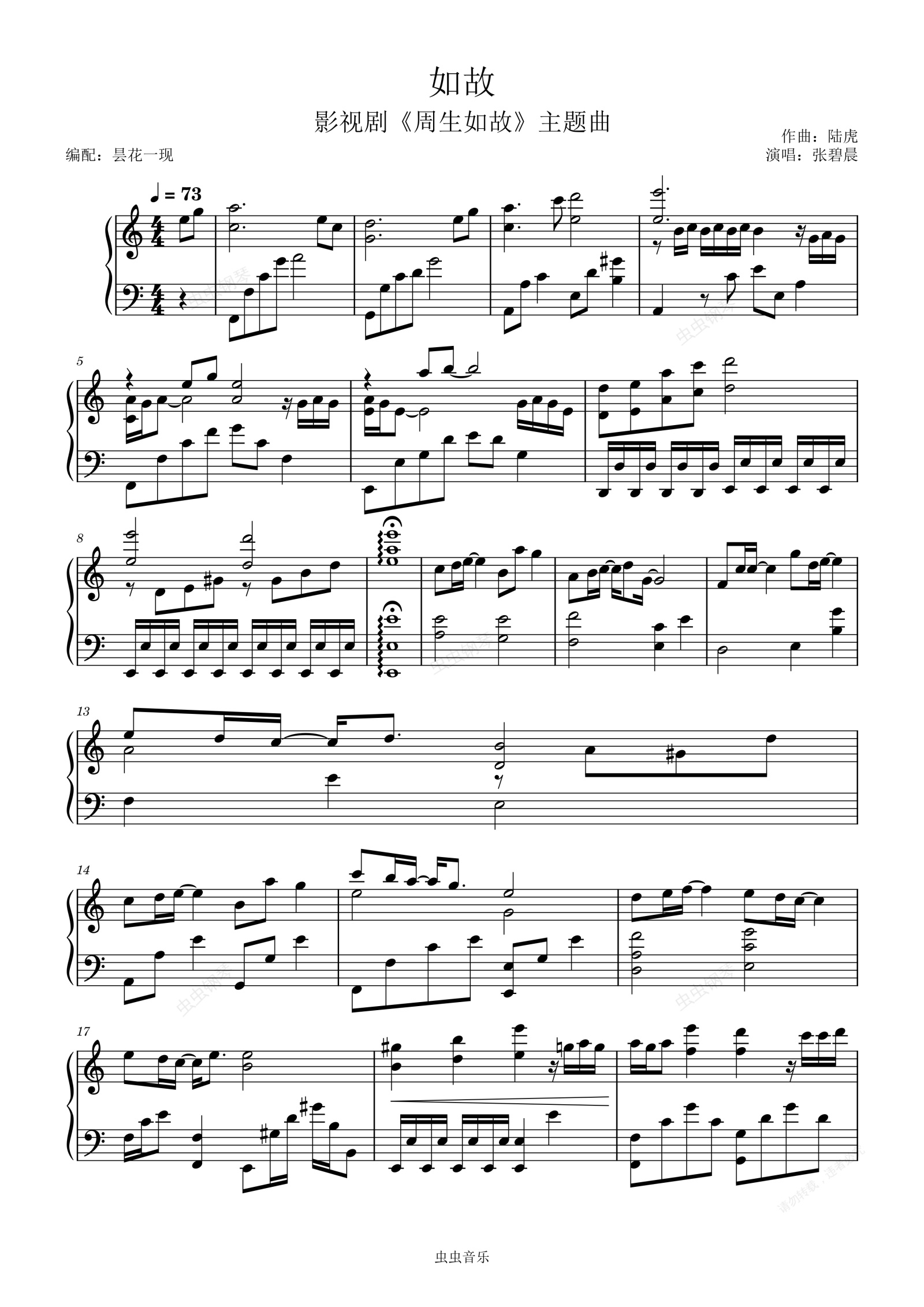 钢琴谱:如故 张碧晨 C大调,影视剧《周生如故》主题曲