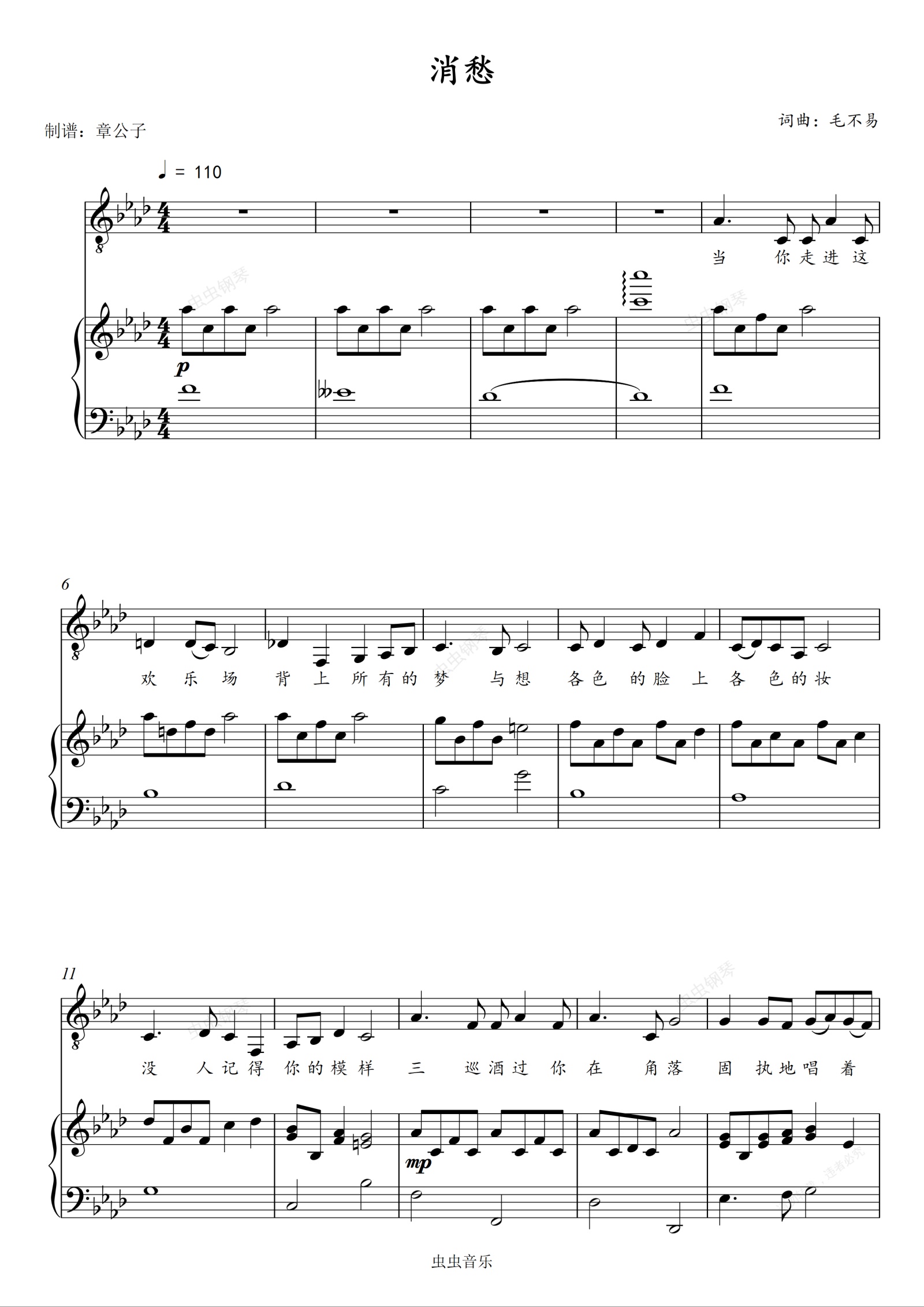 钢琴谱:《消愁》(毛不易)弹唱(伴奏)谱