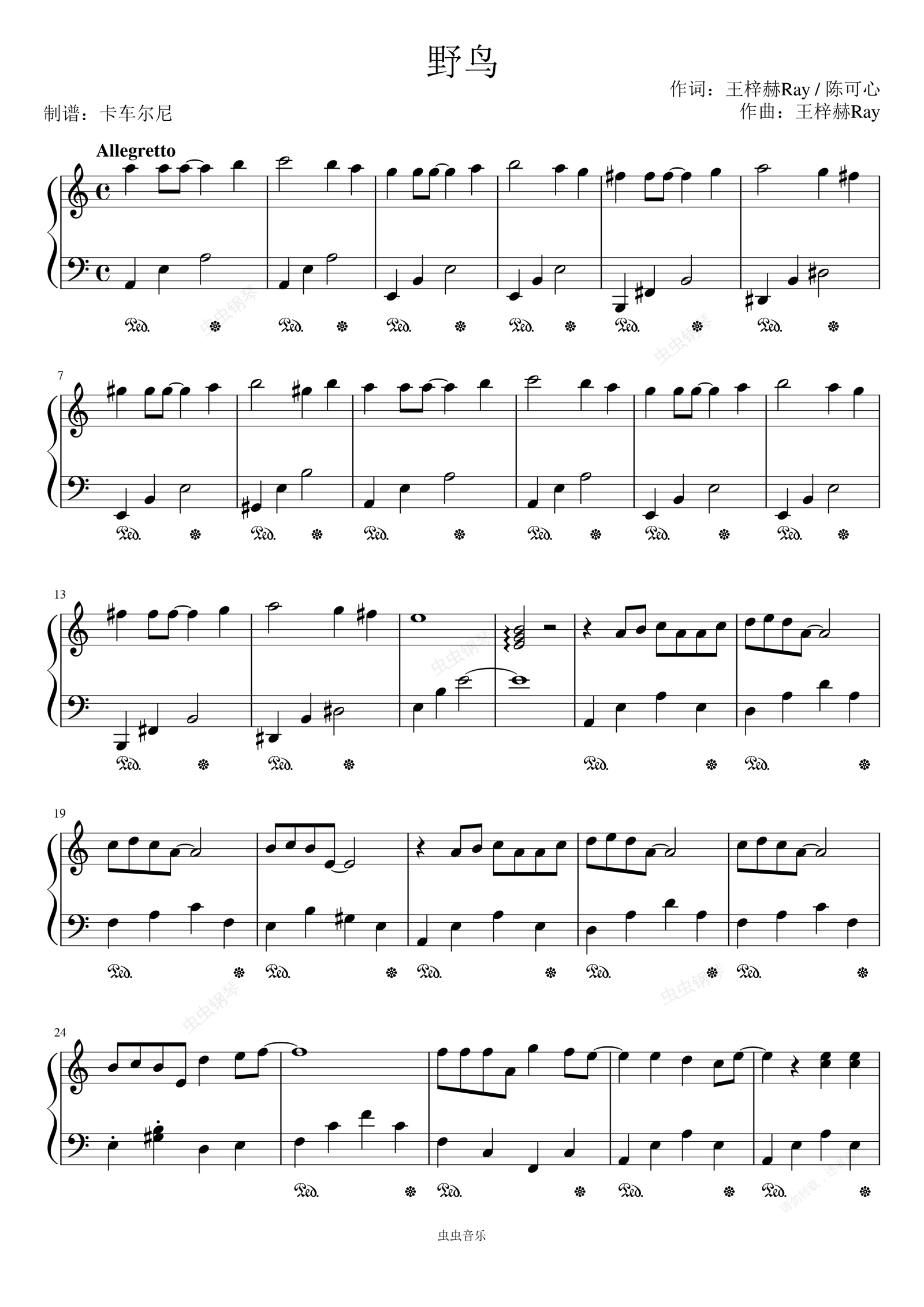 钢琴谱:野鸟 C调简易版 电视剧《乔家的儿女》插曲