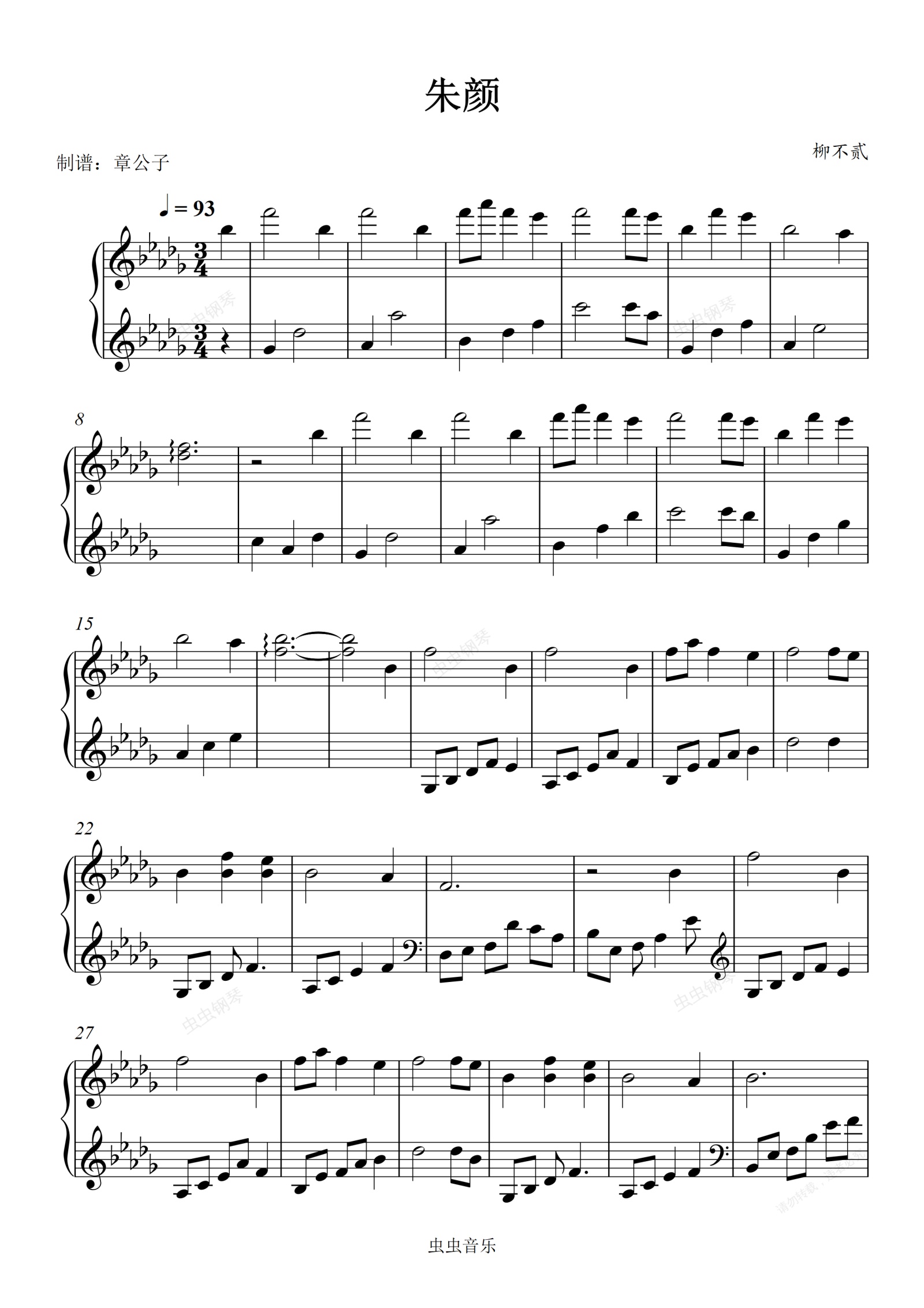 钢琴谱:《朱颜》- 柳不贰 独奏谱