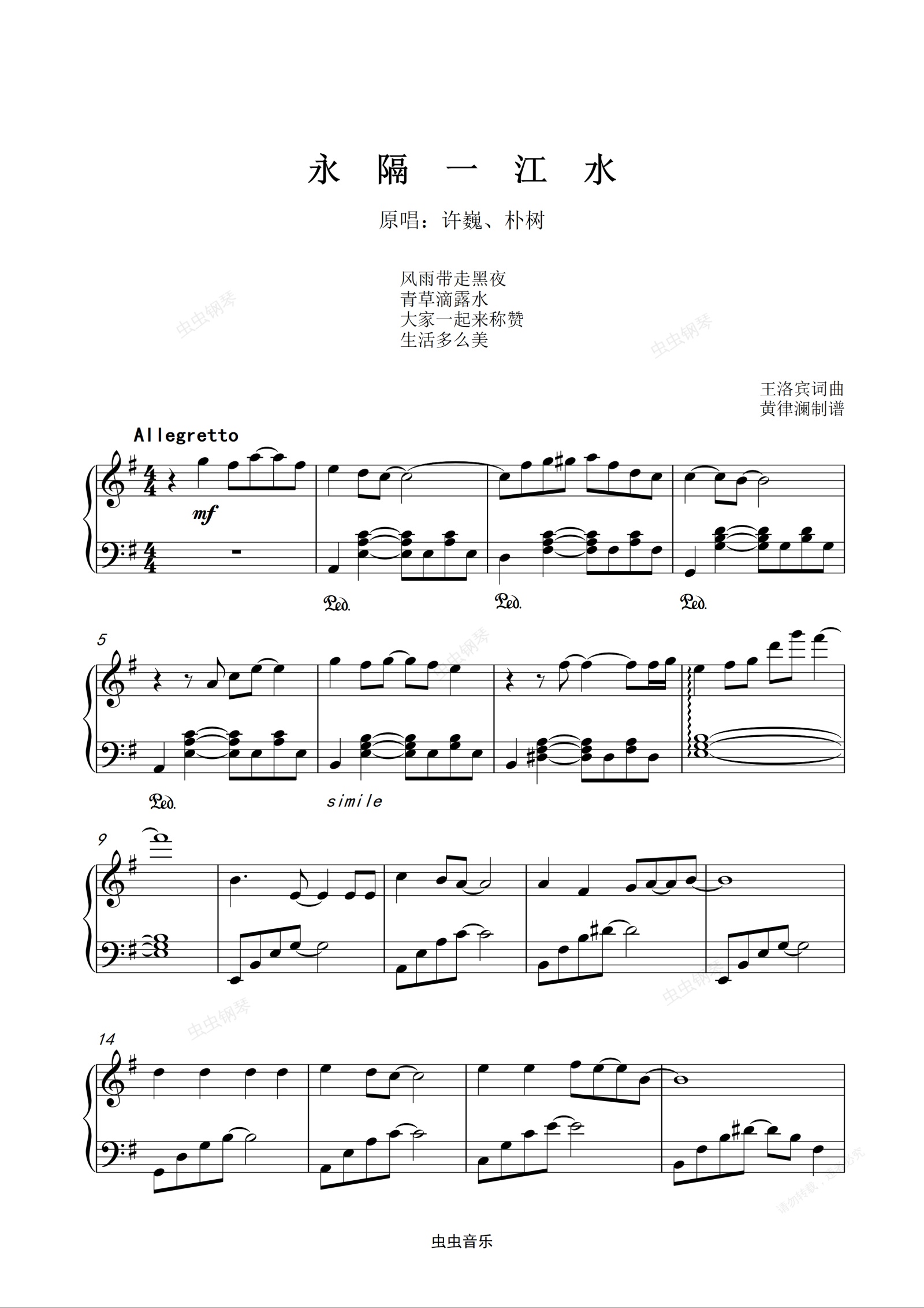 钢琴谱:永隔一江水 许巍、朴树原唱