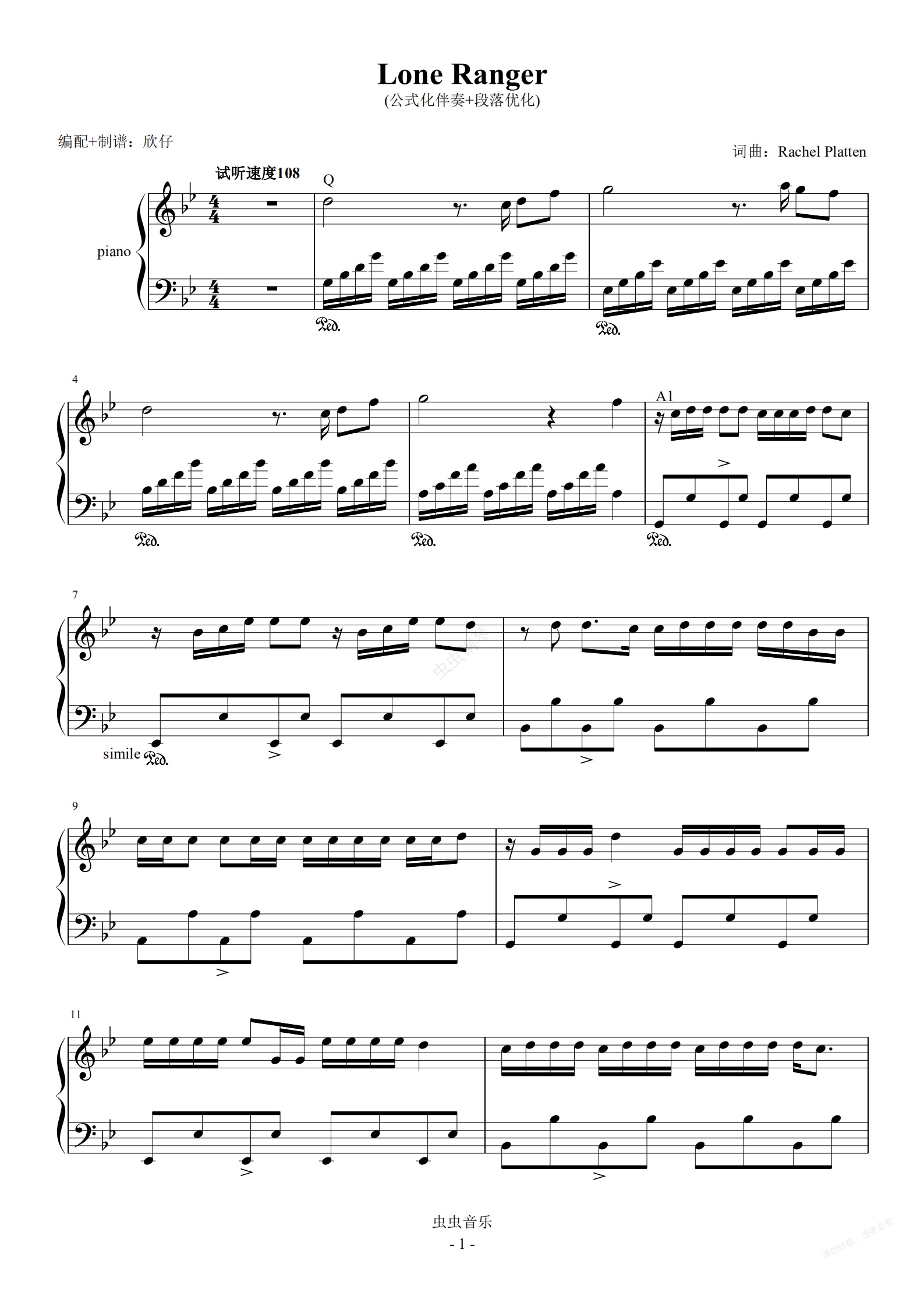 钢琴谱:Rachel Platten-降B《Lone Ranger》(公式化伴奏+段落优化)