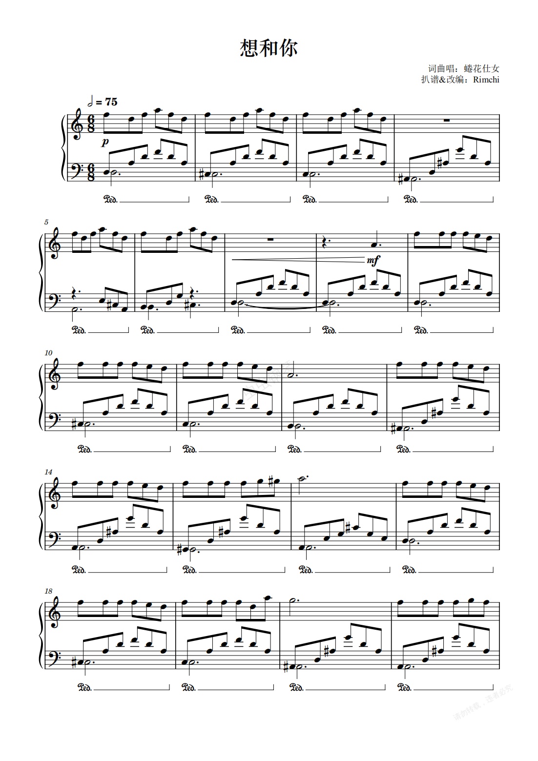 钢琴谱:想和你-蜷花仕女 C调钢琴谱
