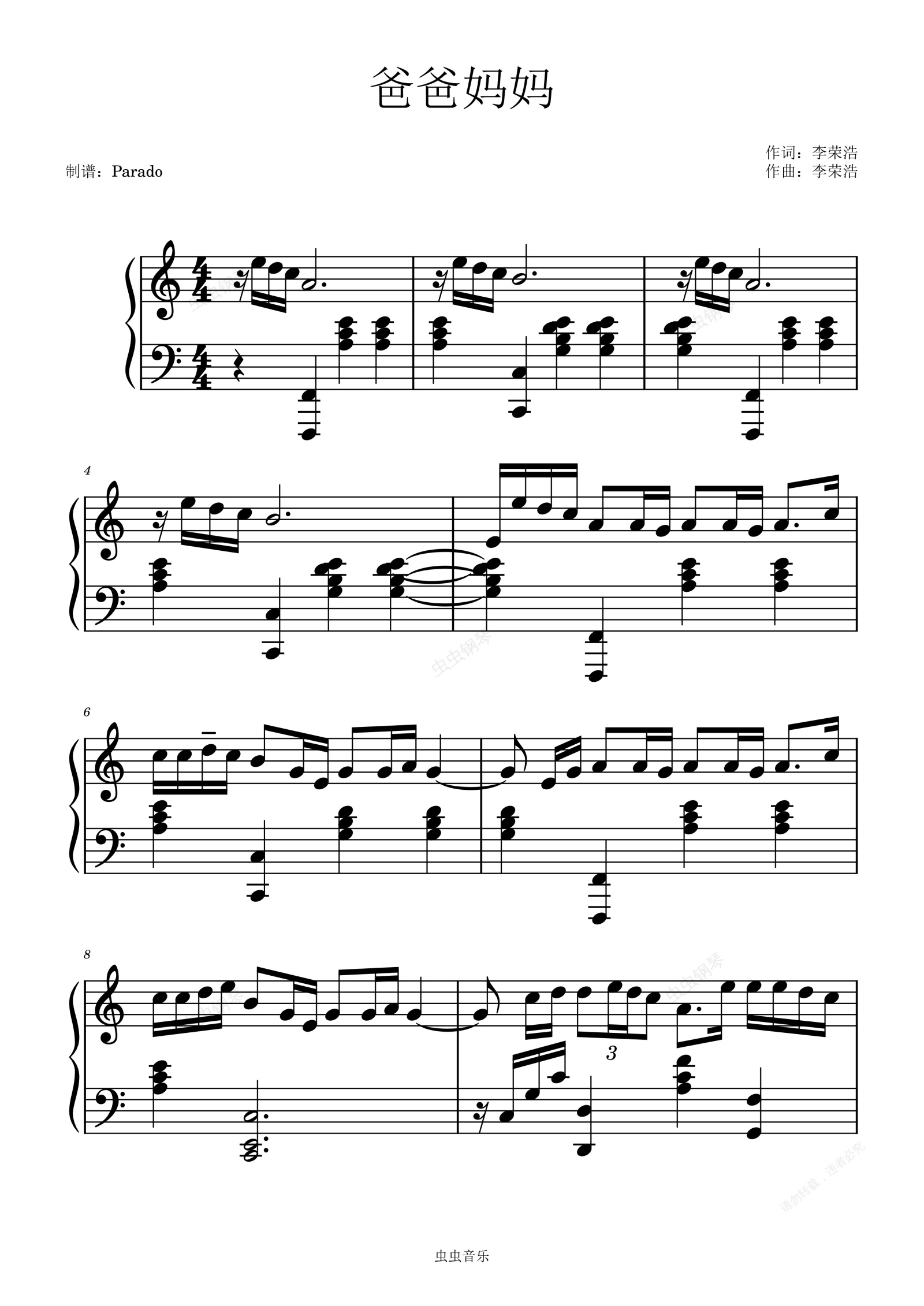 钢琴谱:《爸爸妈妈》-李荣浩-高度还原-C调版-好听又好弹