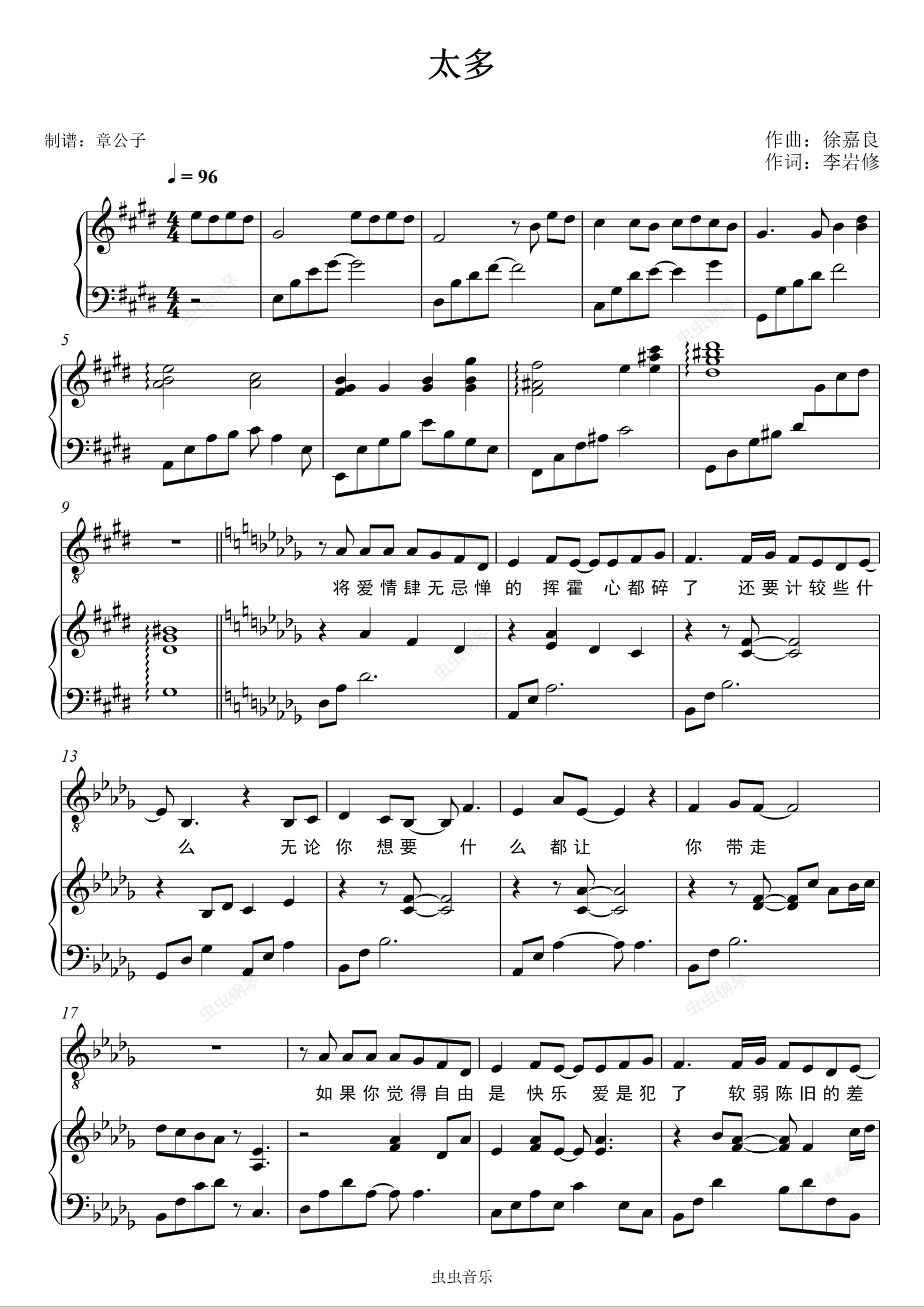 钢琴谱:《太多》- 简弘亦 精编精简版弹唱(伴奏)谱