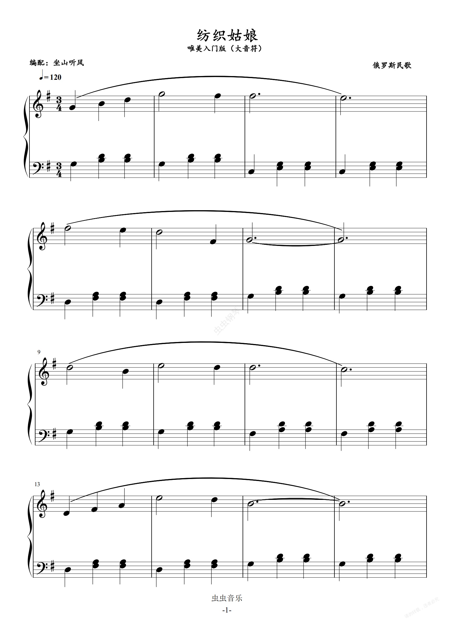 钢琴谱:纺织姑娘——唯美入门版(大音符)