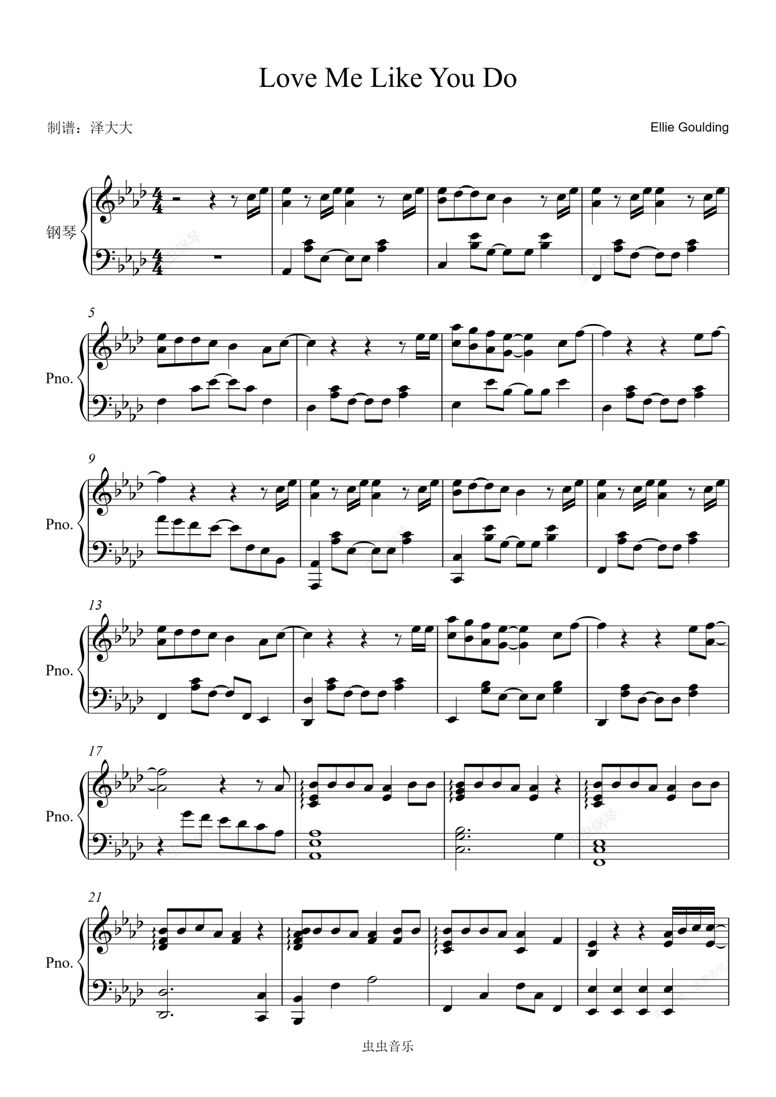 钢琴谱:Love Me Like You Do【完美独奏版】泽大大