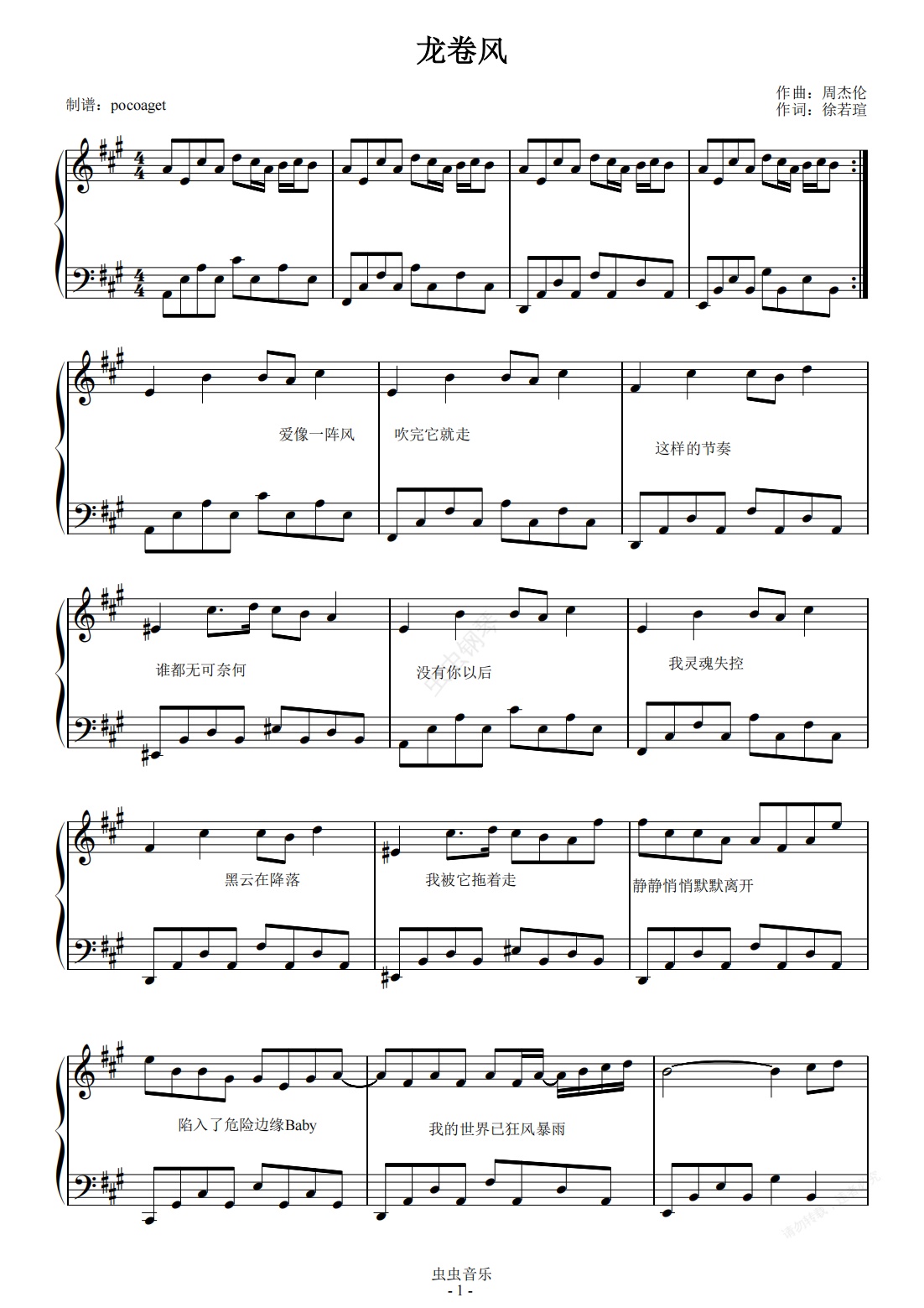 钢琴谱:龙卷风带歌词(poc编配)周董系列