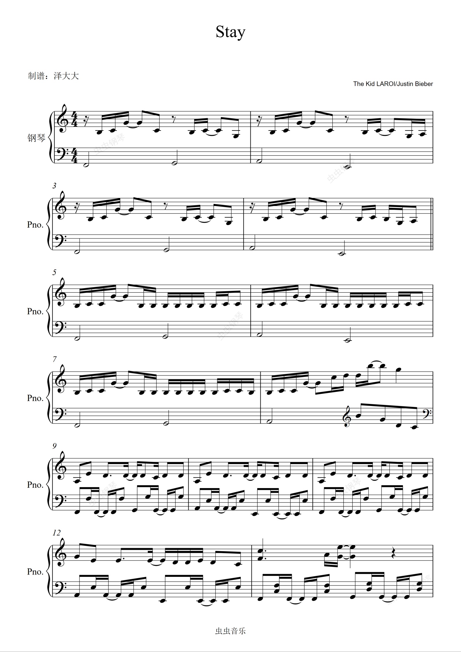钢琴谱:Stay【C调动感独奏版】泽大大 贾斯丁比伯 Justin Bieber