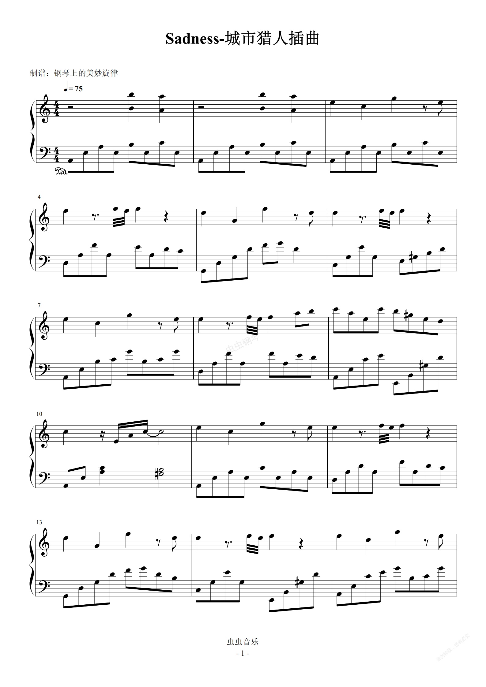钢琴谱:Sadness C调 城市猎人插曲  非常好听的插曲