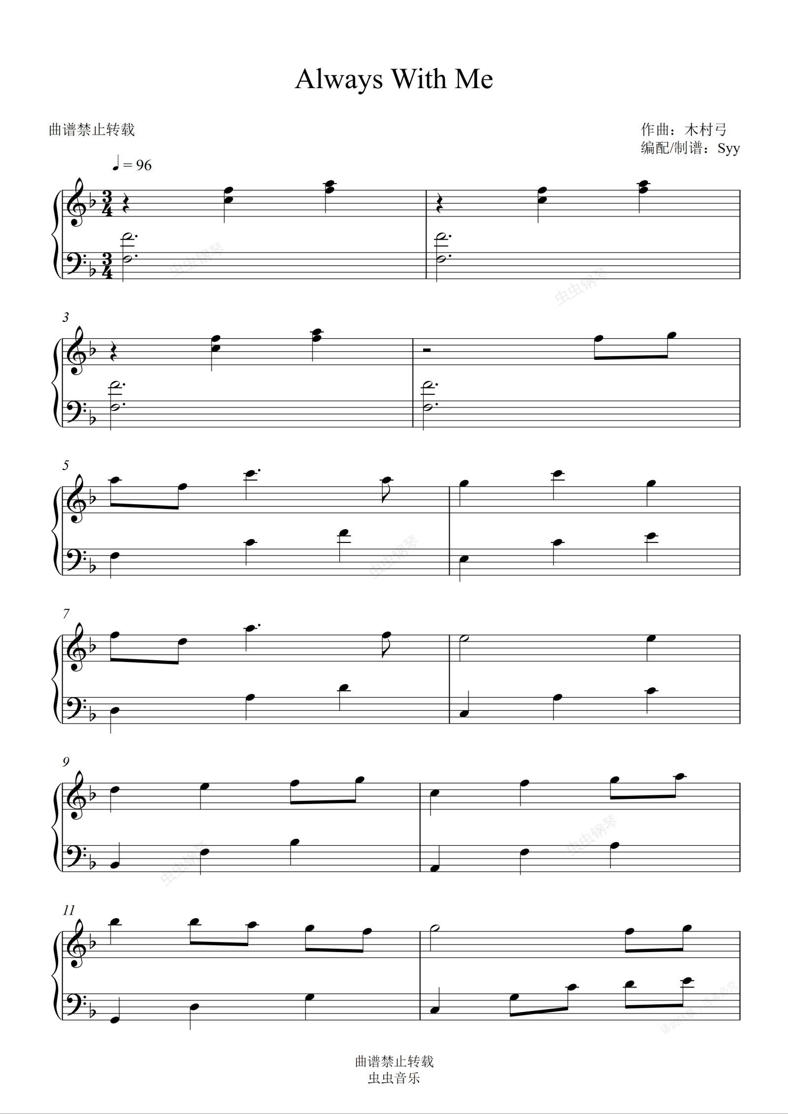 钢琴谱:好听易弹【Always with me永远同在/亲爱的旅人啊】木村弓 周深《千与千寻》OST