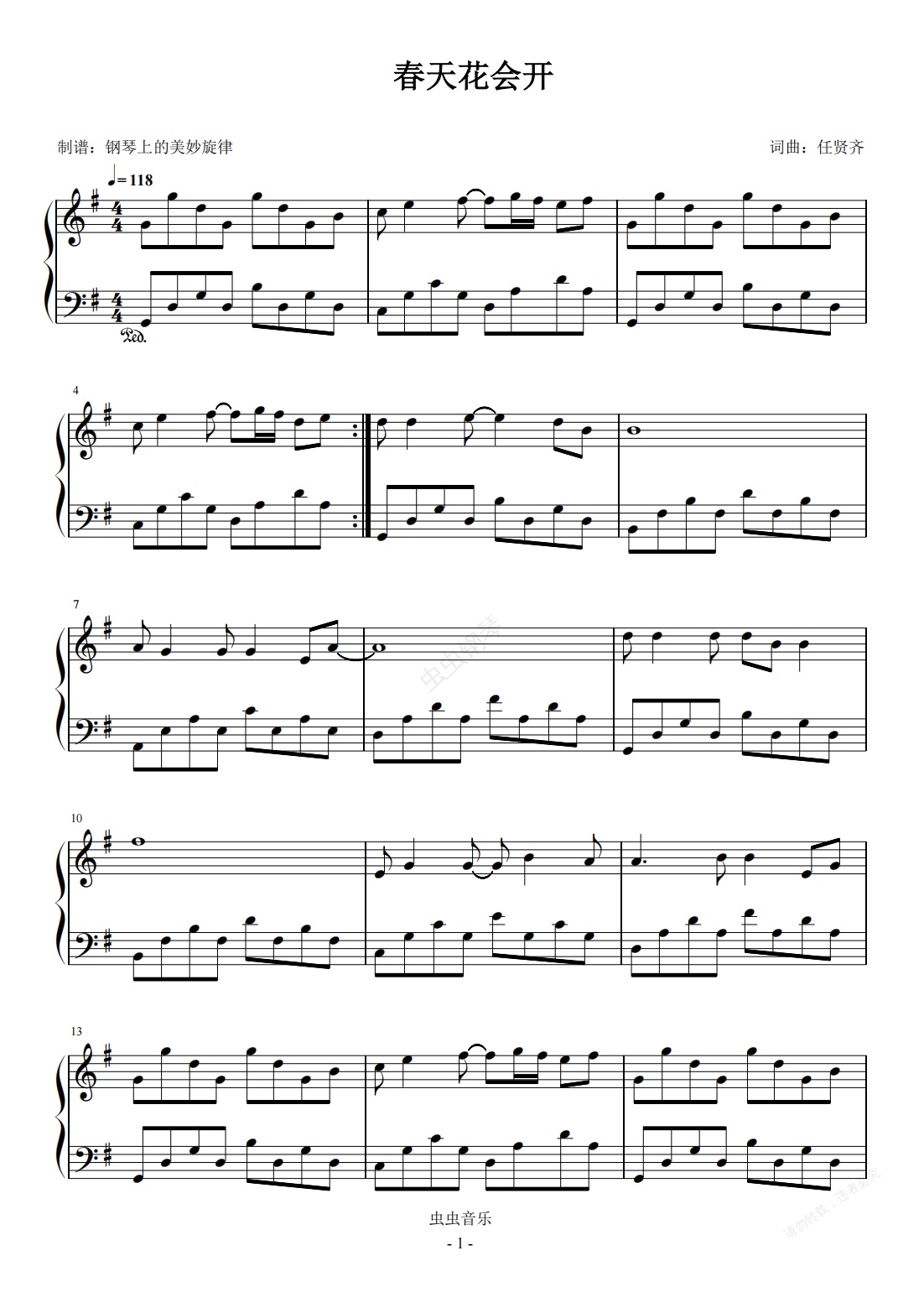 钢琴谱:春天花会开 简易版 任贤齐 流行经典