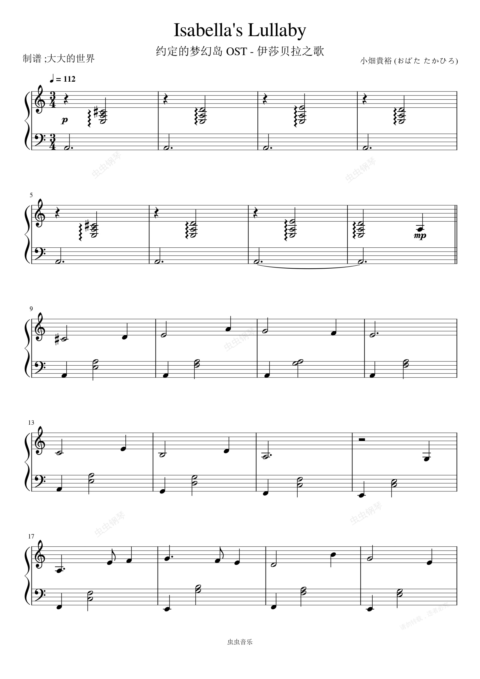 钢琴谱:约定的梦幻岛 - 伊莎贝拉之歌(Isabella's Lullaby)