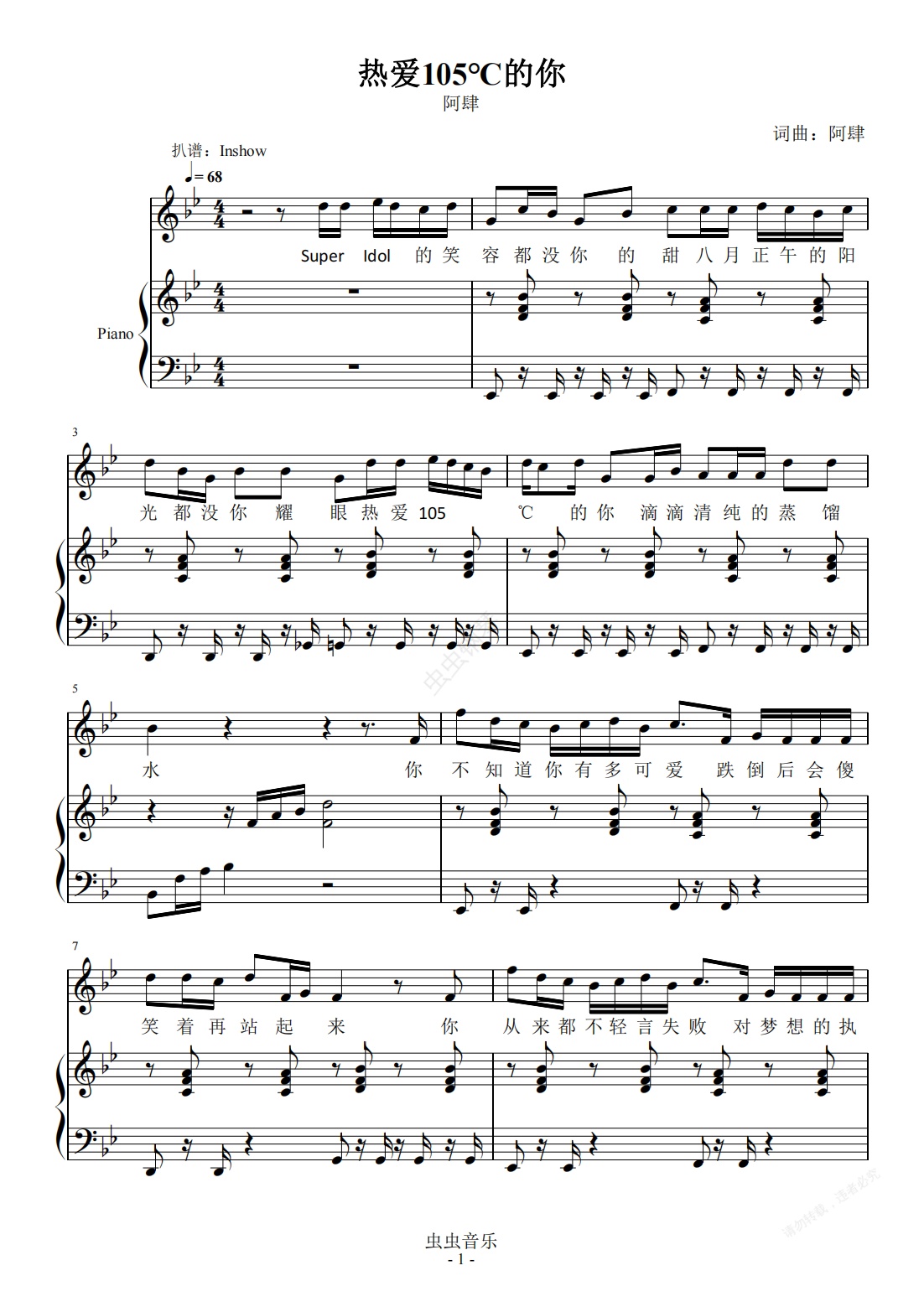 钢琴谱:热爱105℃的你【完整弹唱】- 阿肆 -