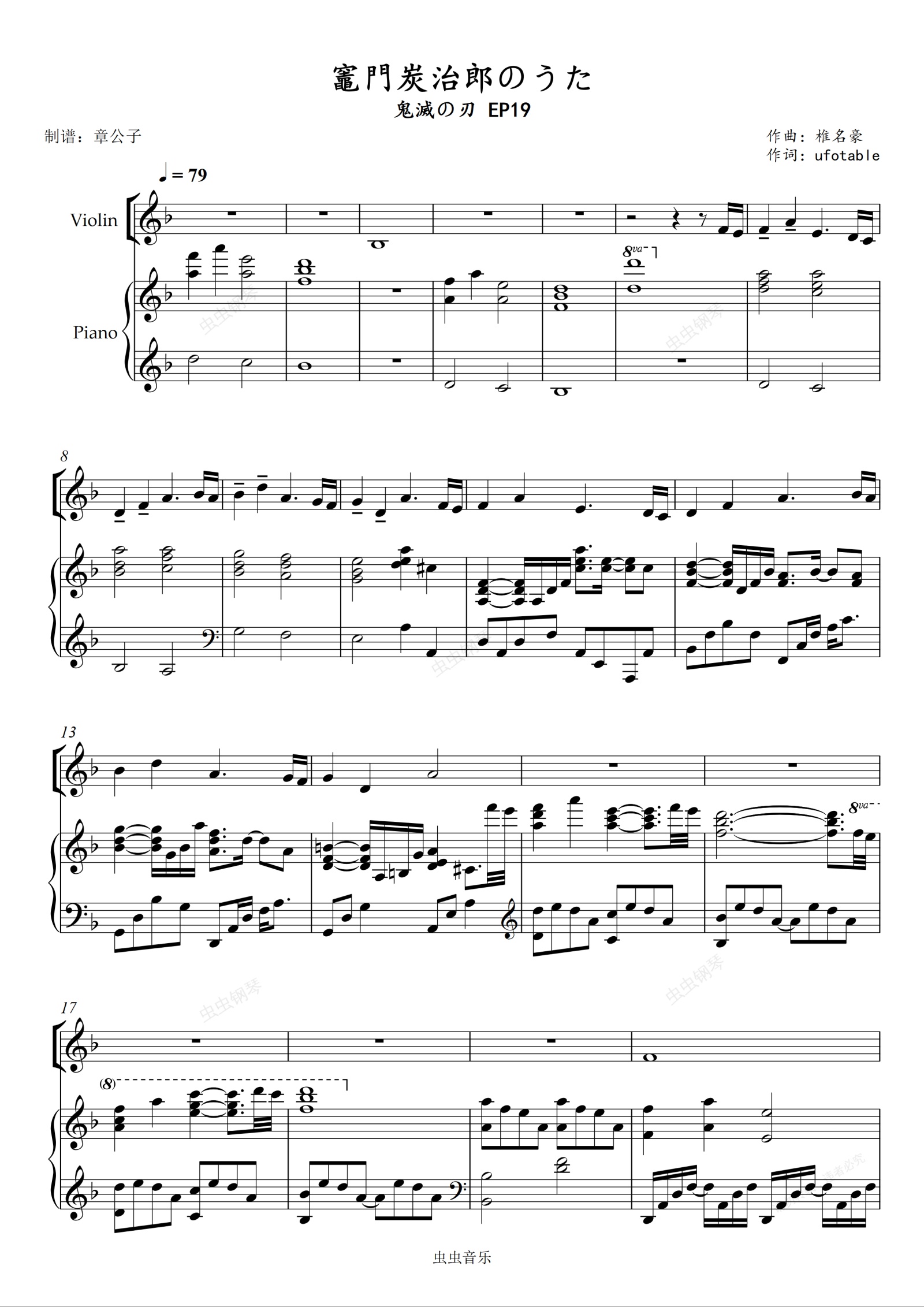 钢琴谱:《竈門炭治郎のうた》灶门炭治郎之歌 钢琴小提琴合奏谱