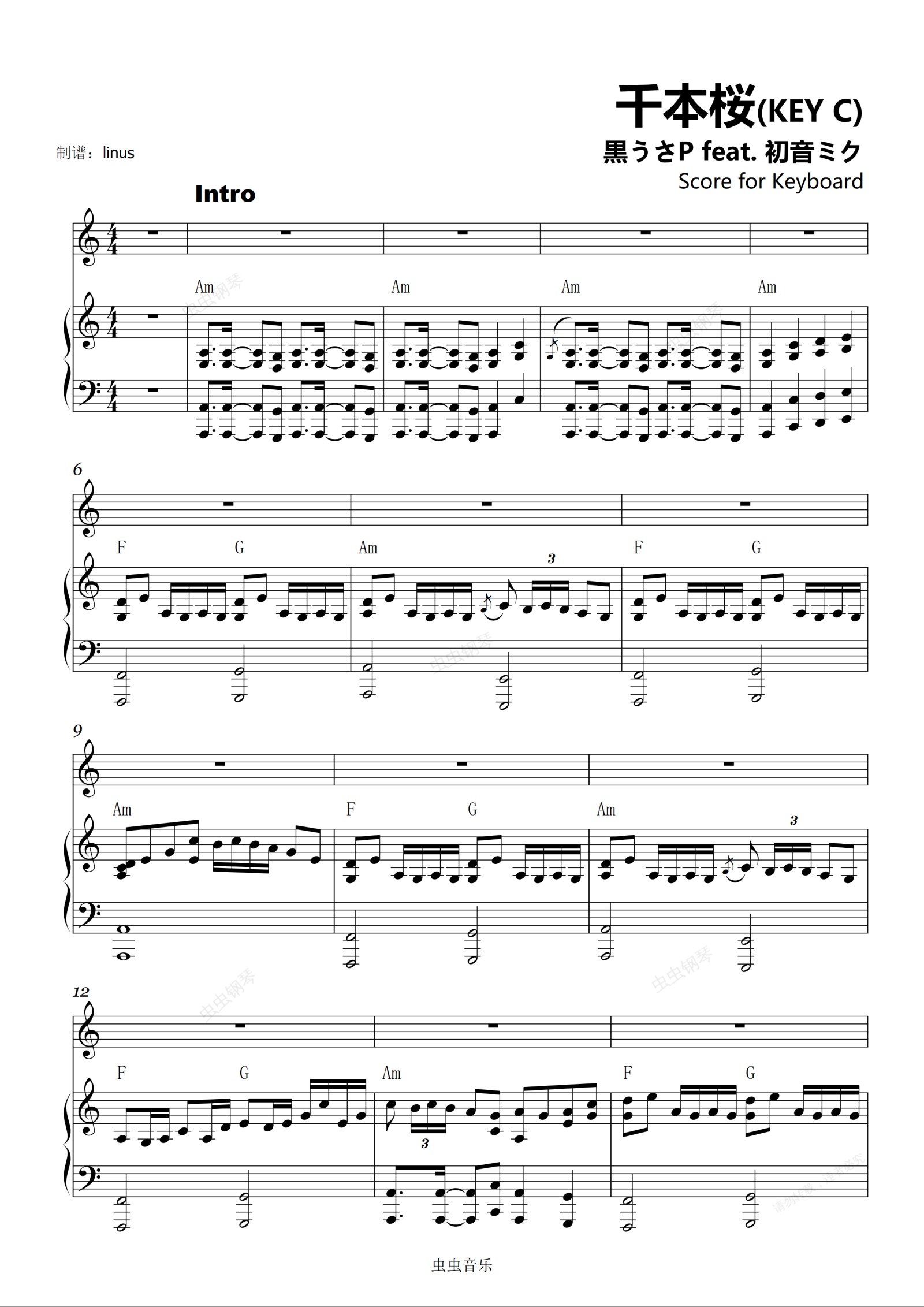 钢琴谱:【C调】【千本桜 /千本樱】C调谱/歌词/和弦 & 全曲CUT PIANO音频伴奏