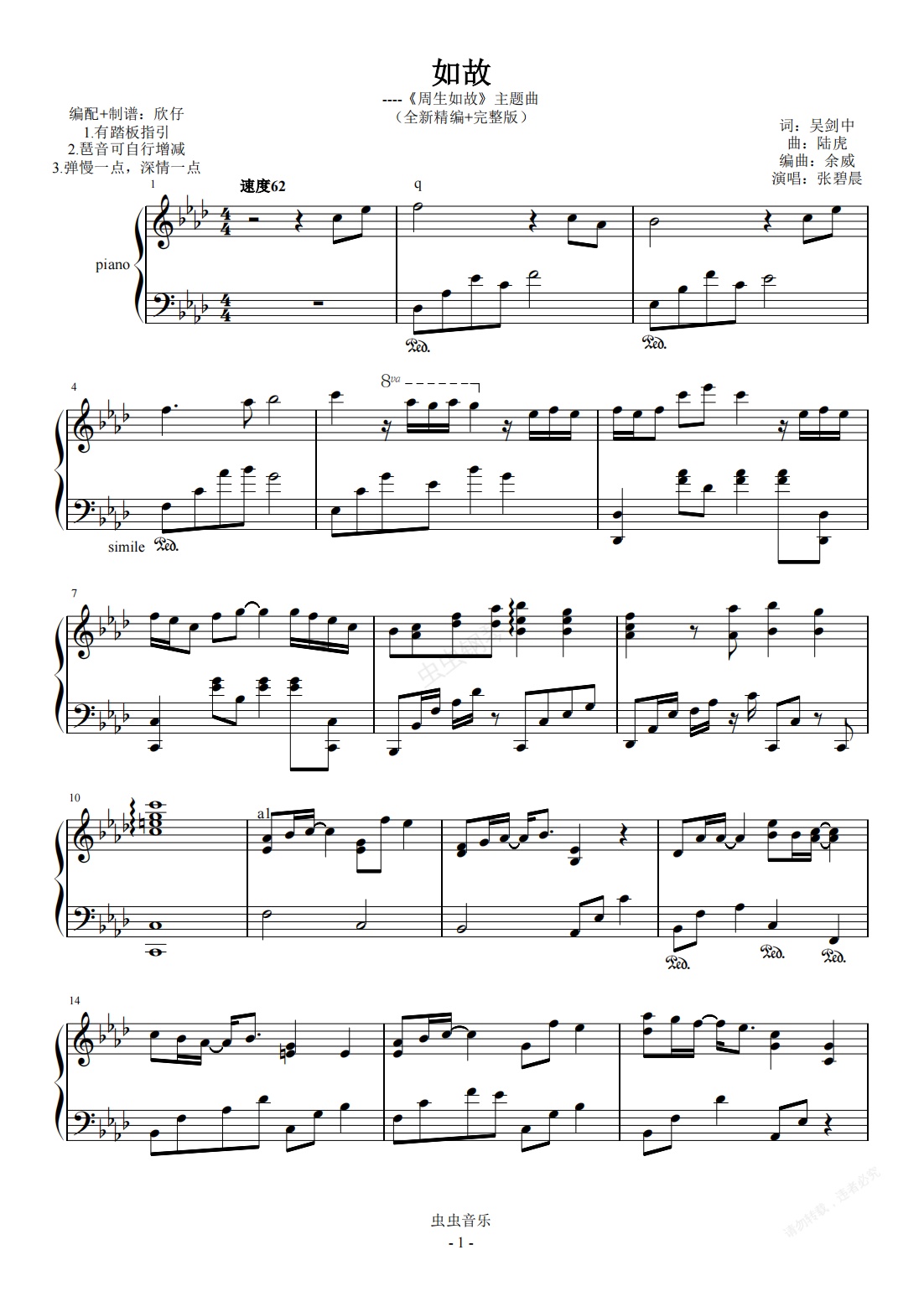 钢琴谱:张碧晨-降A《如故》(《周生如故》主题曲、全新精编+完整版)