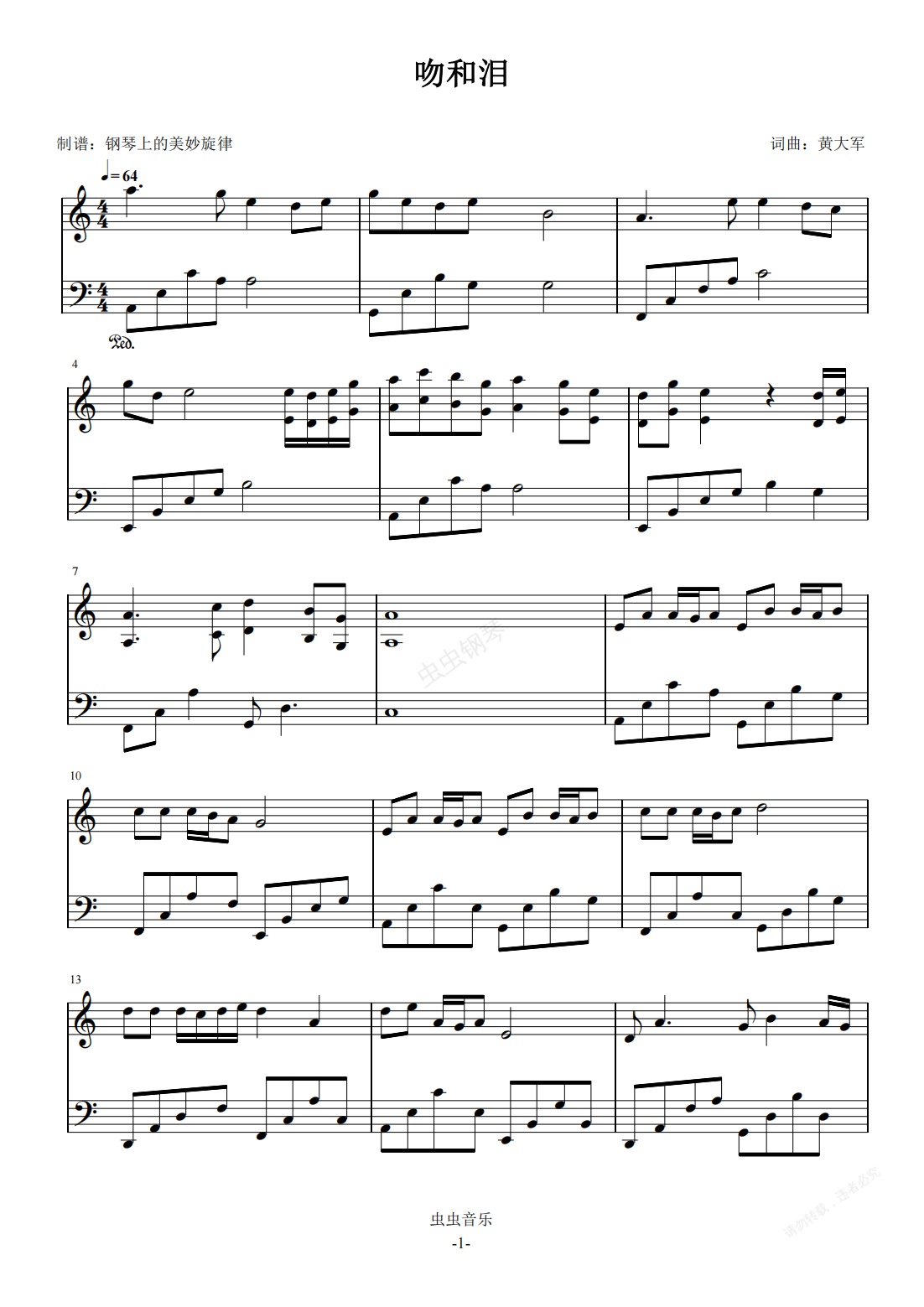钢琴谱:吻和泪(情深海更深) C调简易版本 周子寒