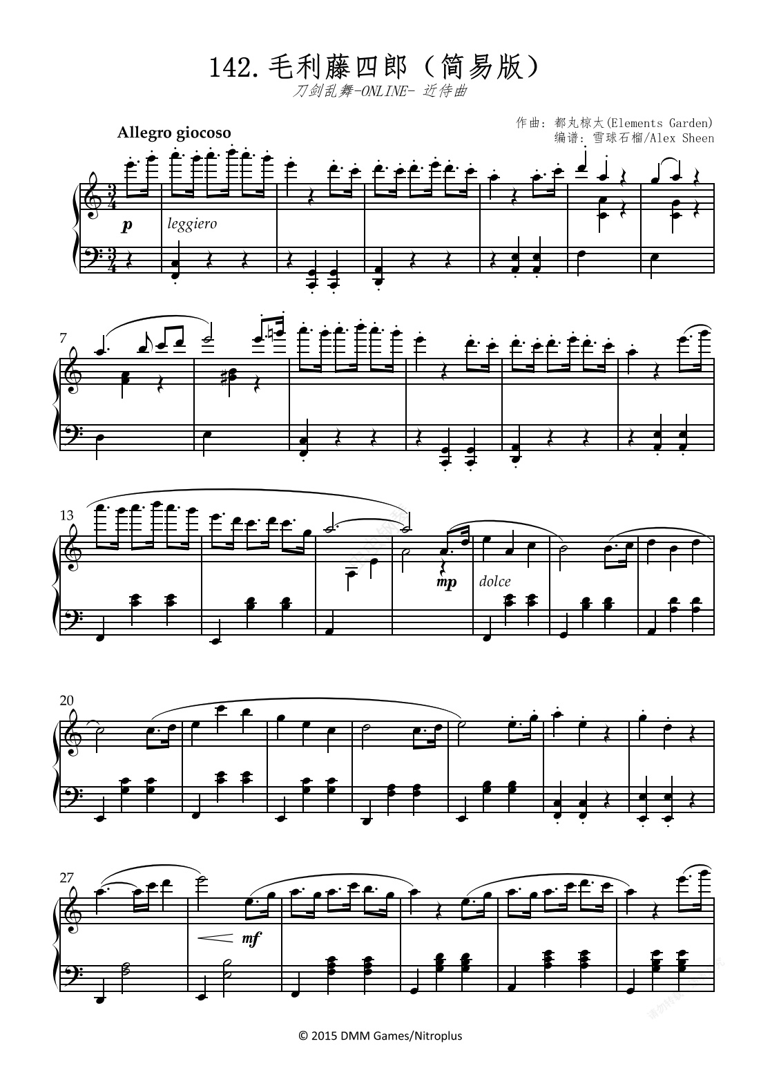 钢琴谱:毛利藤四郎 近侍曲 【刀剑乱舞】(简易版)