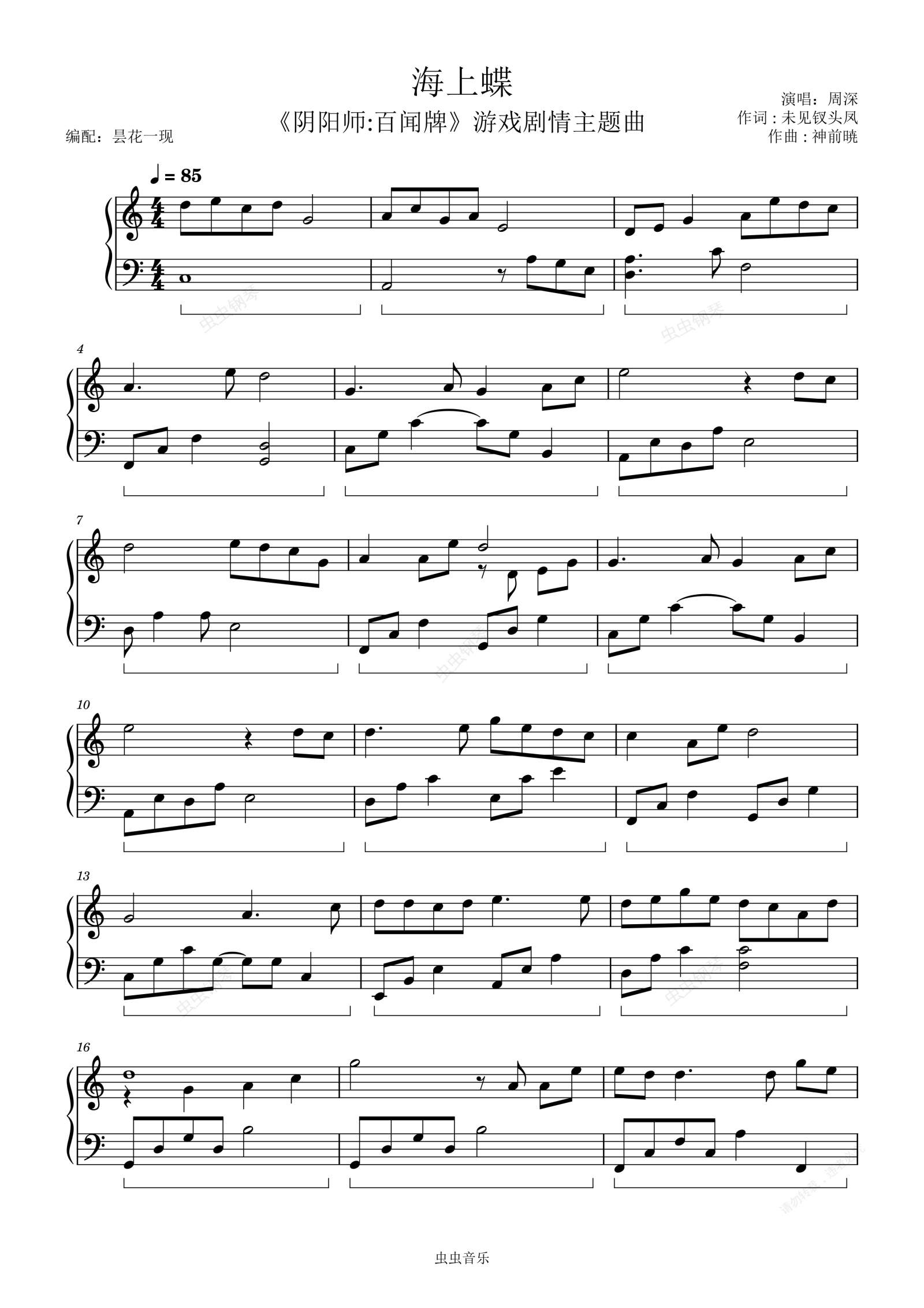 钢琴谱:海上蝶 周深 C大调简化版《阴阳师:百闻牌》游戏剧情主题曲