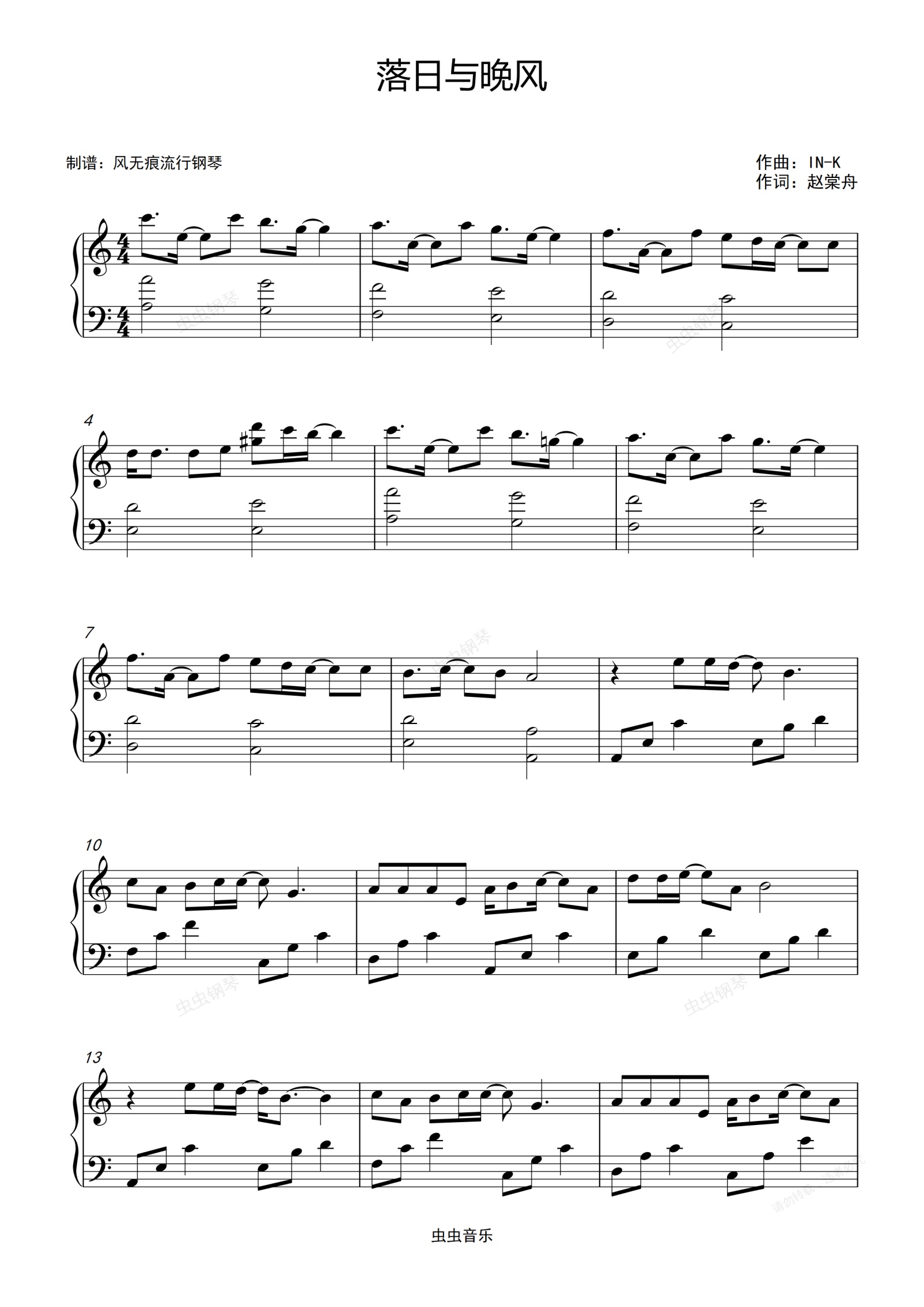 钢琴谱:原调-落日与晚风-IN-K / 王忻辰 / 苏星婕〖简易版〗