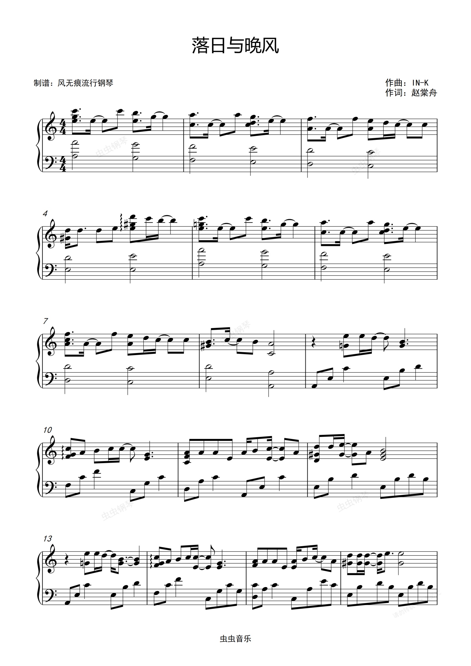 钢琴谱:C调-落日与晚风-IN-K / 王忻辰 / 苏星婕〖丰富版〗