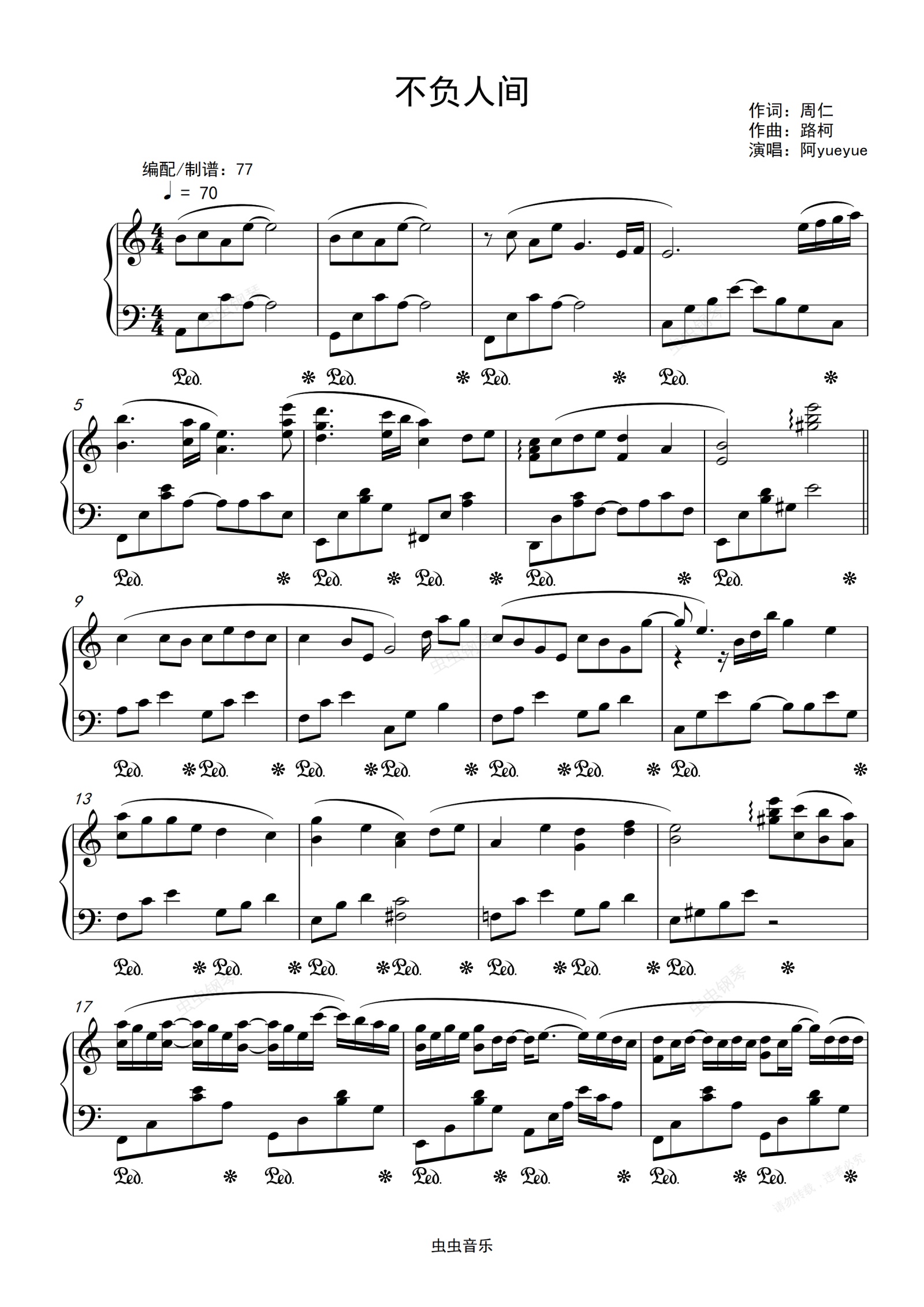 钢琴谱:阿YueYue-《不负人间》高度还原