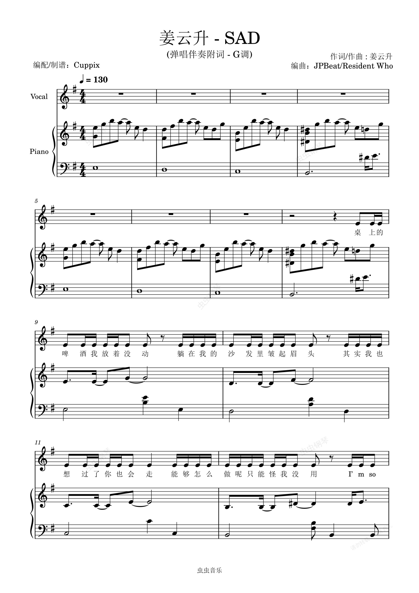 钢琴谱:姜云升《SAD》弹唱伴奏附词 - G调版