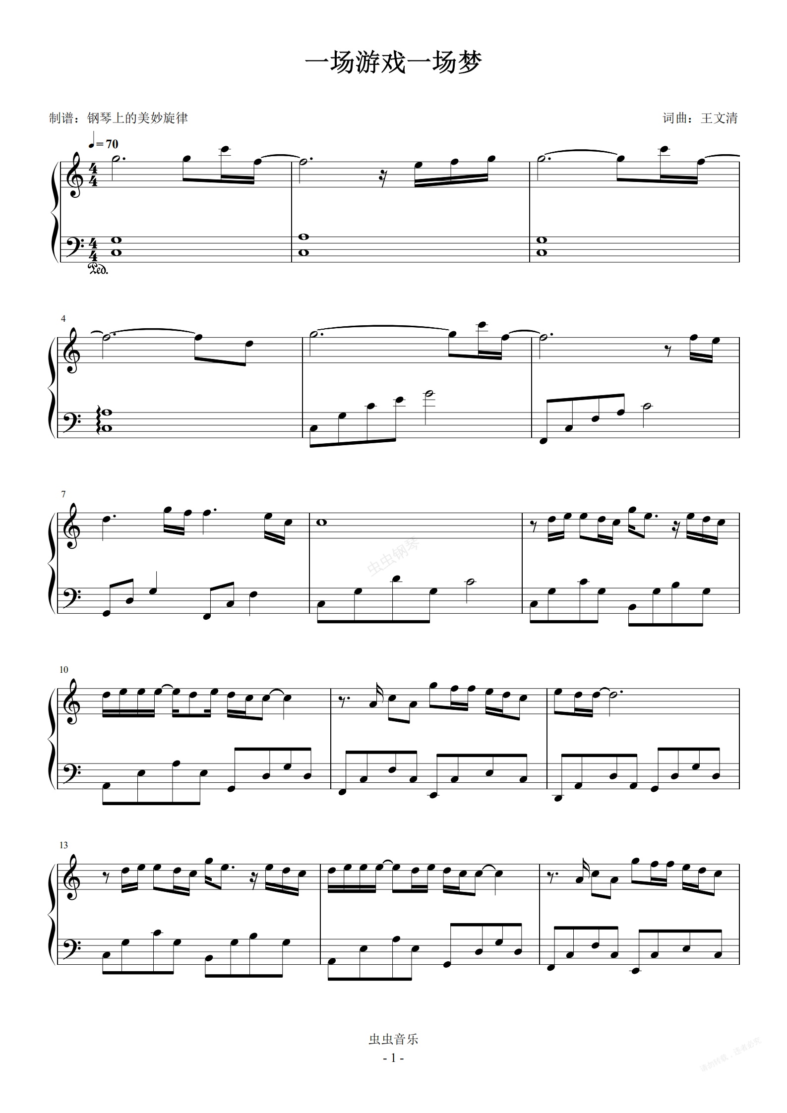 钢琴谱:一场游戏一场梦 C调简易版 王杰