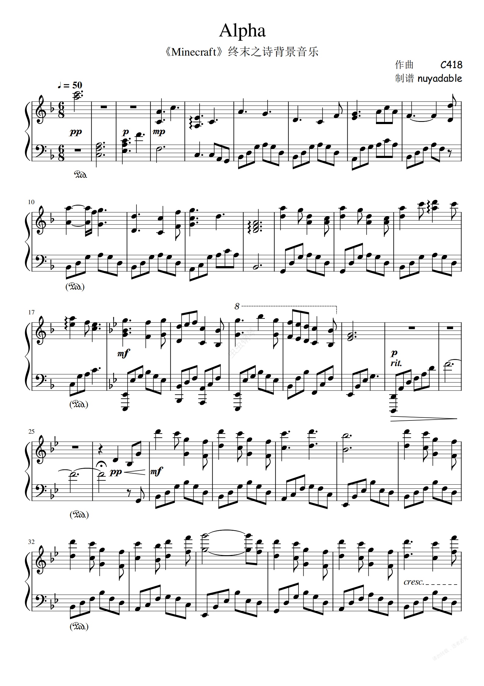 钢琴谱:Alpha(Minecraft终末之诗背景音乐)钢琴独奏谱·原调