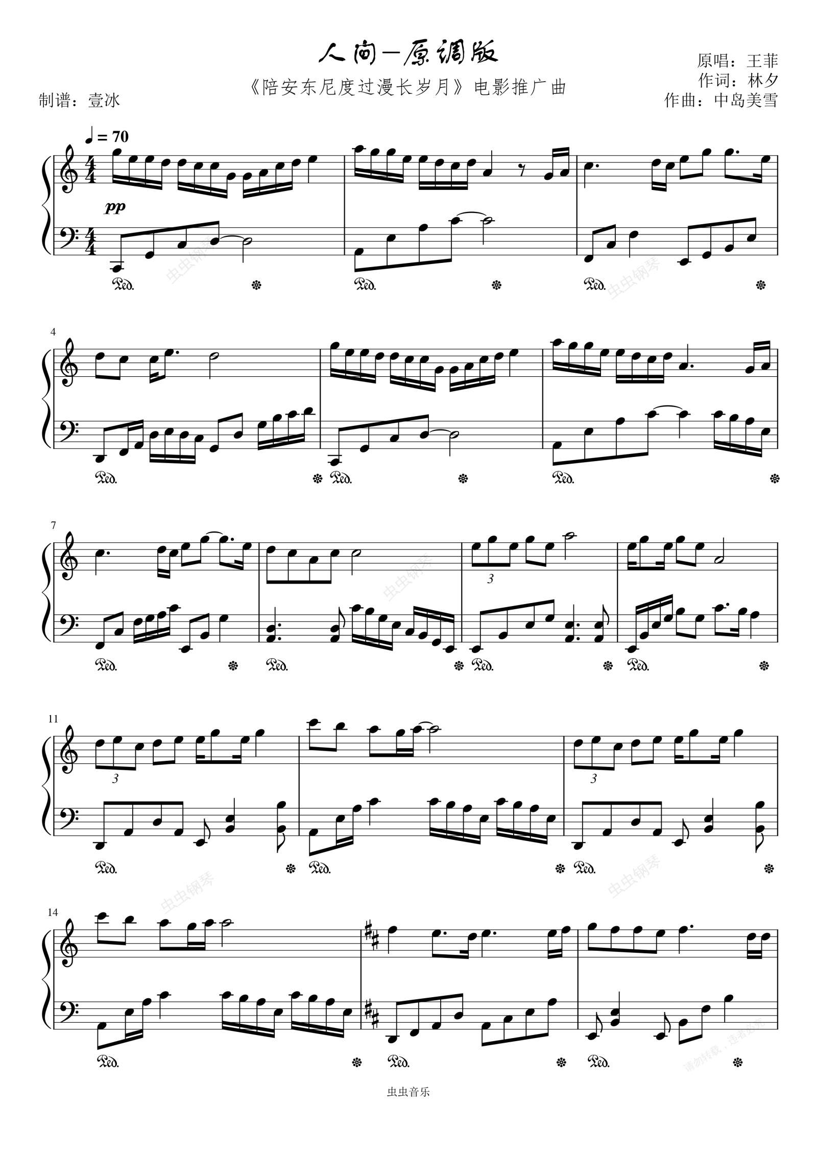 钢琴谱:人间//《陪安东尼度过漫长岁月》电影推广曲 王菲