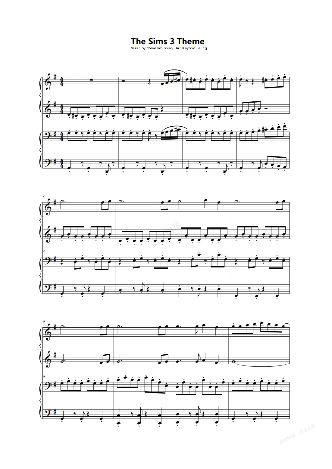 钢琴谱:模拟人生3 The Sims 3 主题曲钢琴四手联弹版(高还原度)