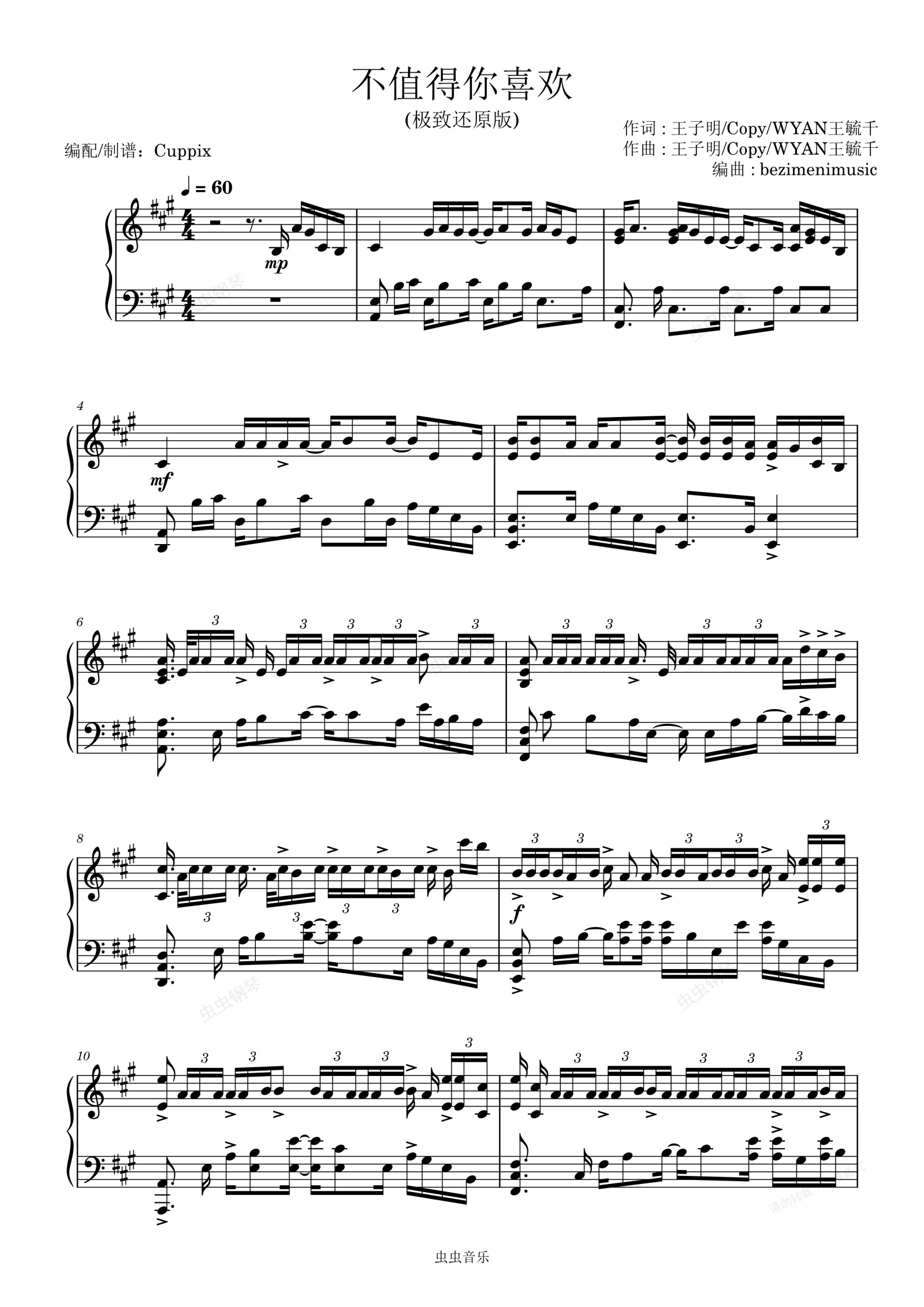 钢琴谱:《不值得你喜欢》Cuppix编配-极致还原(王子明,Copy,WYAN王毓千)