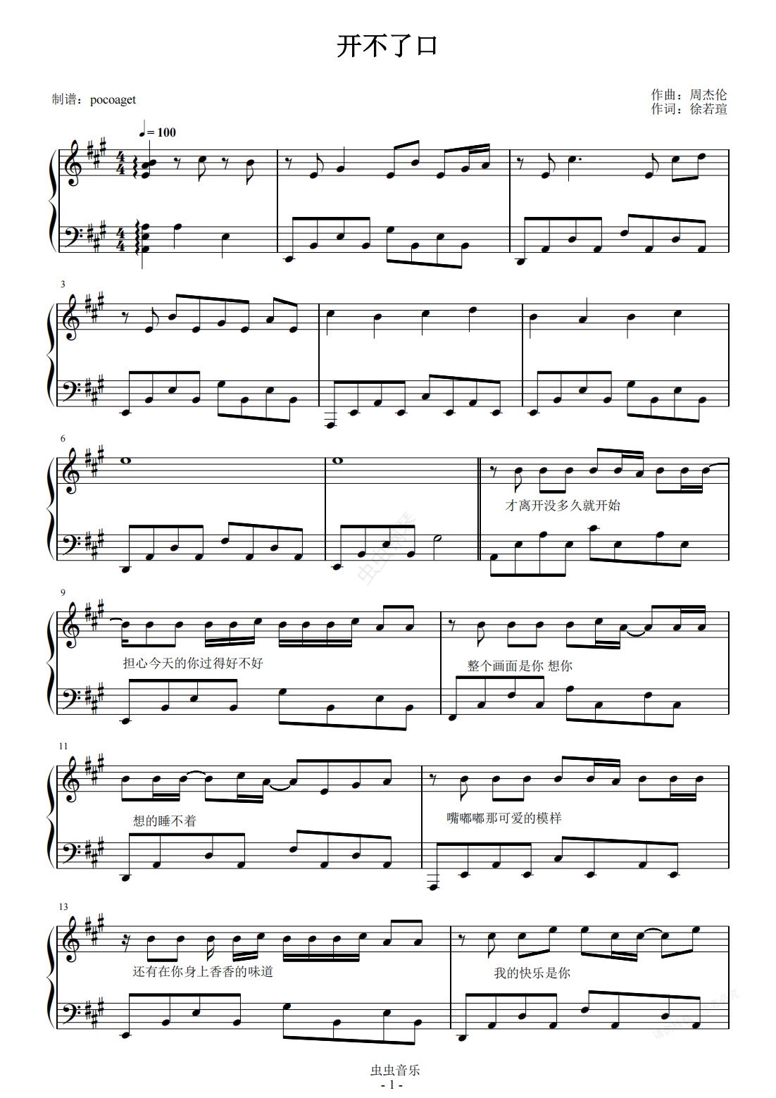 钢琴谱:周杰伦《开不了口》带歌词(poc编配)周董初学者系列