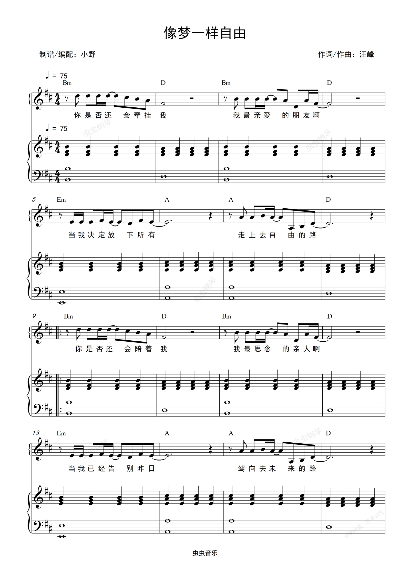 钢琴谱:像梦一样自由(和弦弹唱版)