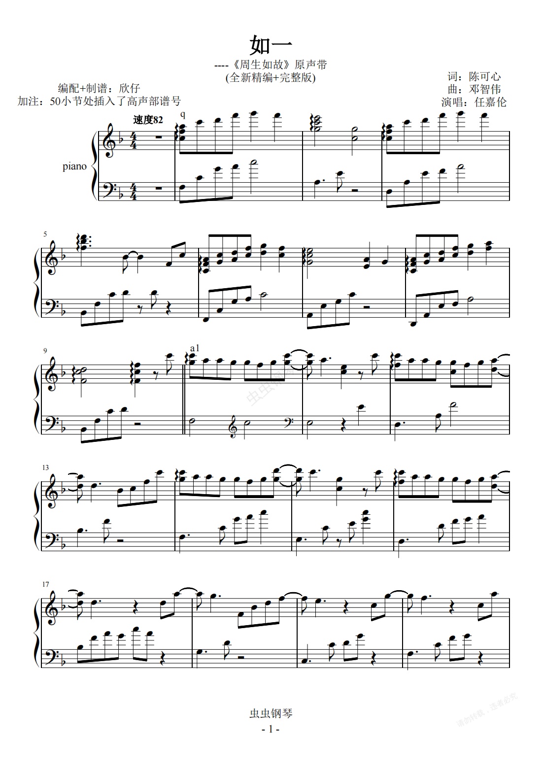 钢琴谱:任嘉伦-F《如一》(《周生如故》原声带、全新精编+完整版)