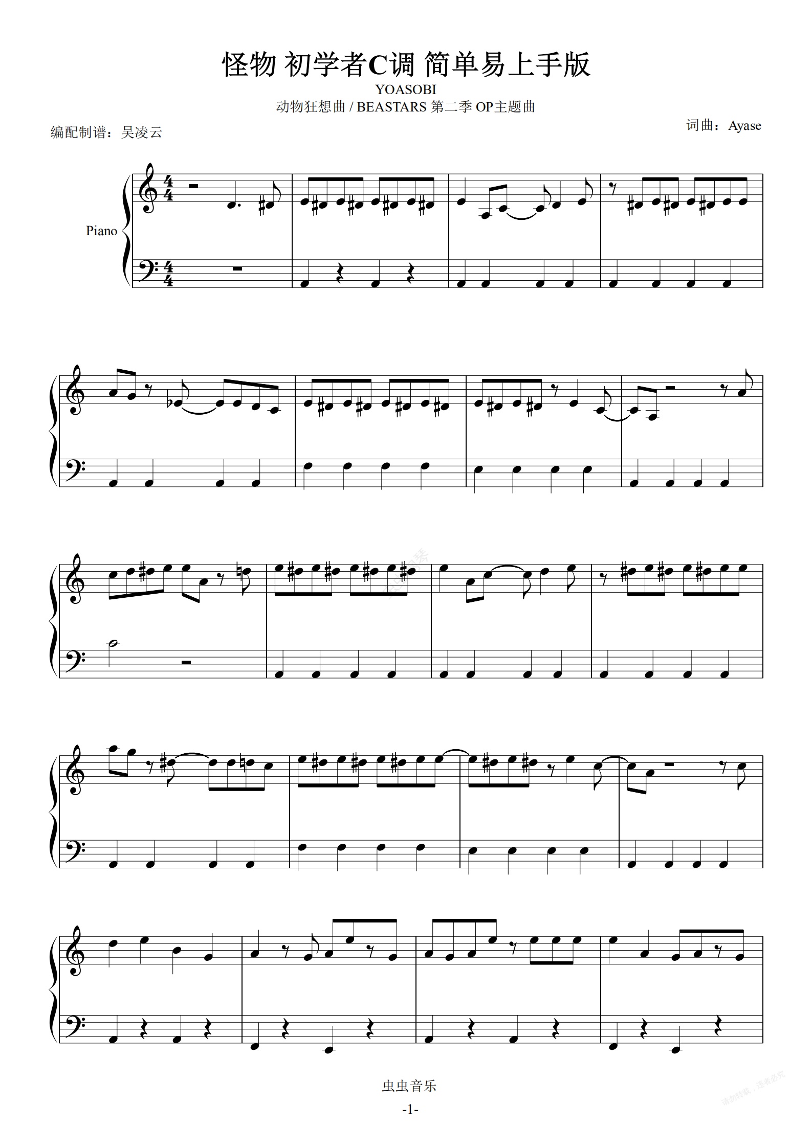 钢琴谱:怪物 YOASOBI 初学者C调 简单易上手版 动物狂想曲 / BEASTARS 第二季 OP主题曲 吴凌云编制版