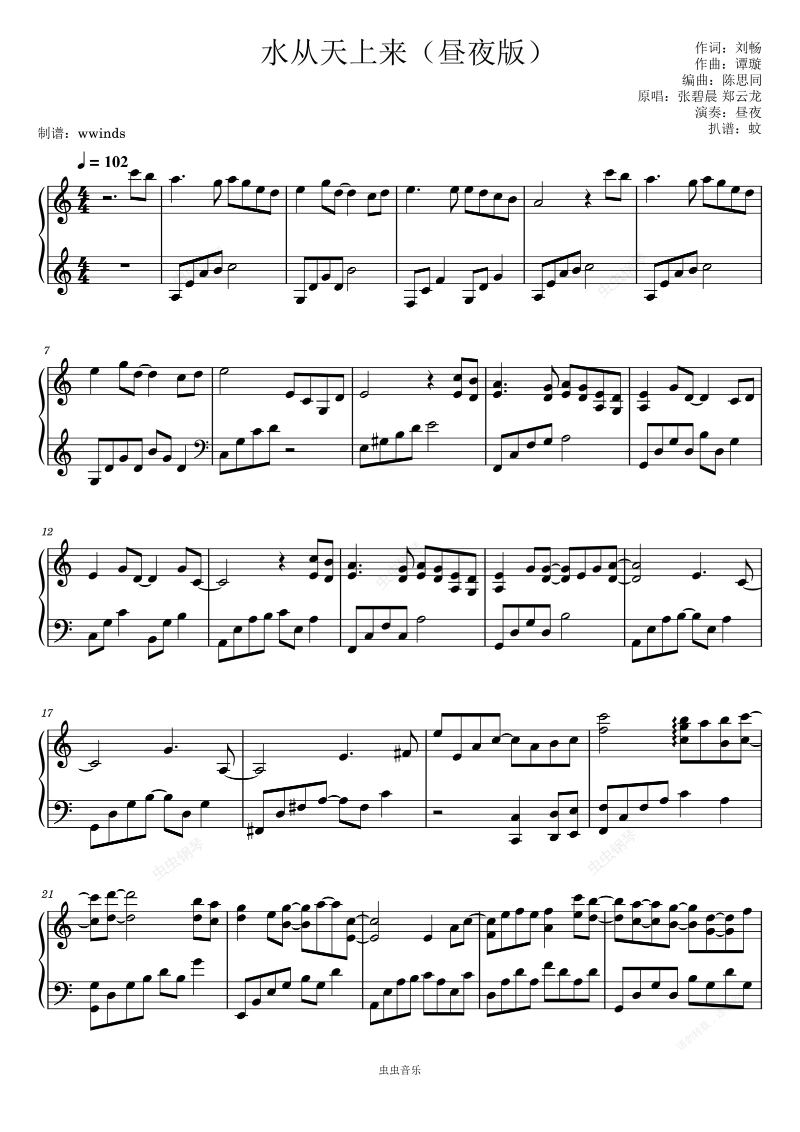钢琴谱:【郑云龙&张碧晨】《水从天上来》(昼夜版)